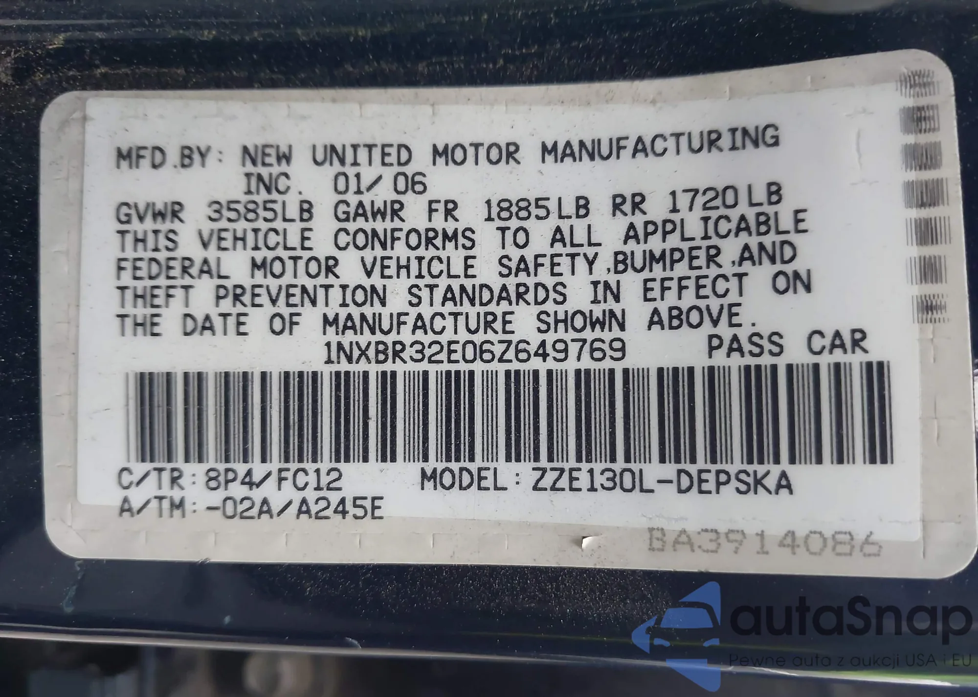 LOT: 43588096 VIN: 1NXBR32E06Z649769