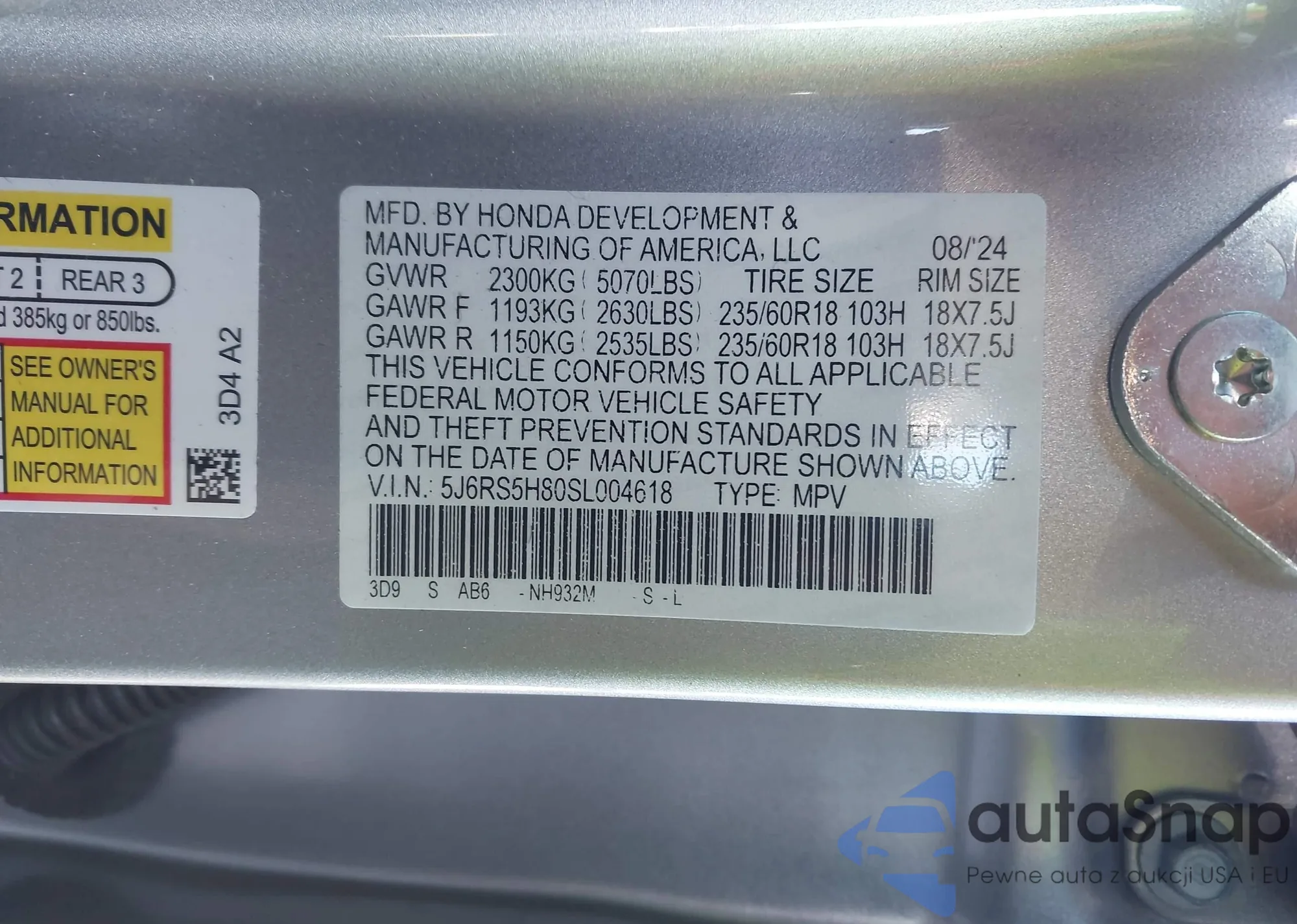 • VIN 5J6RS5H80SL004618