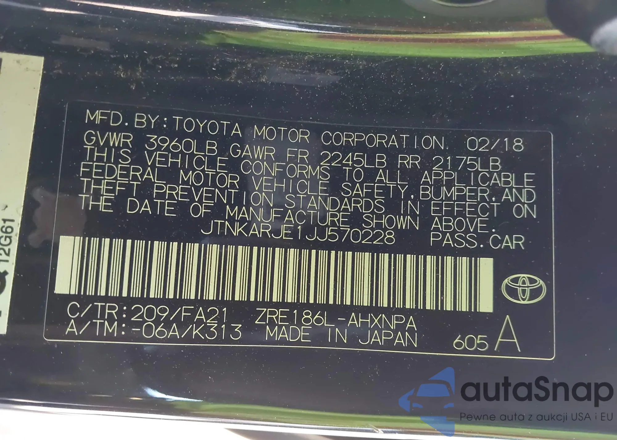 LOT: 43894536 VIN: JTNKARJE1JJ570228