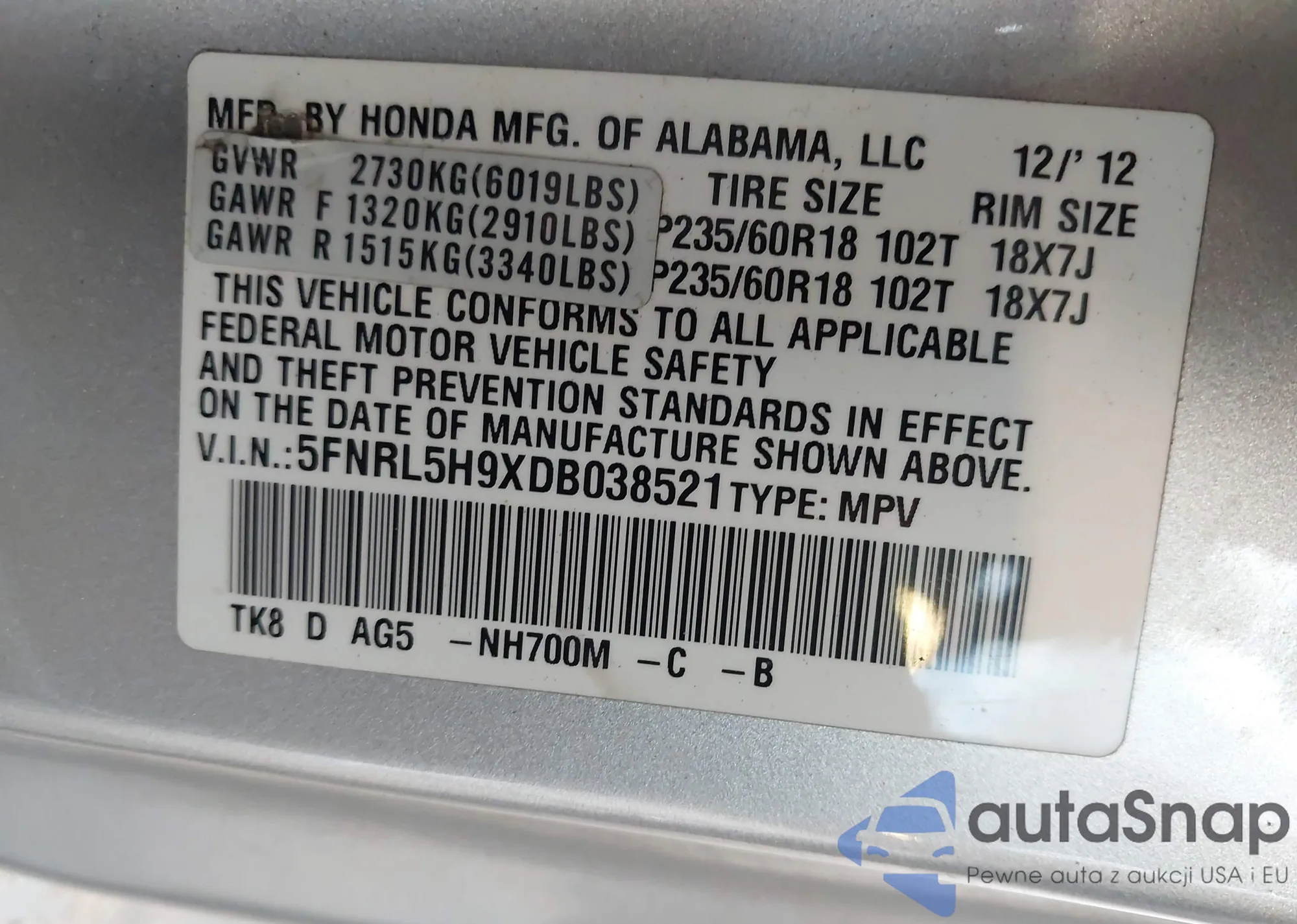 • VIN 5FNRL5H9XDB038521