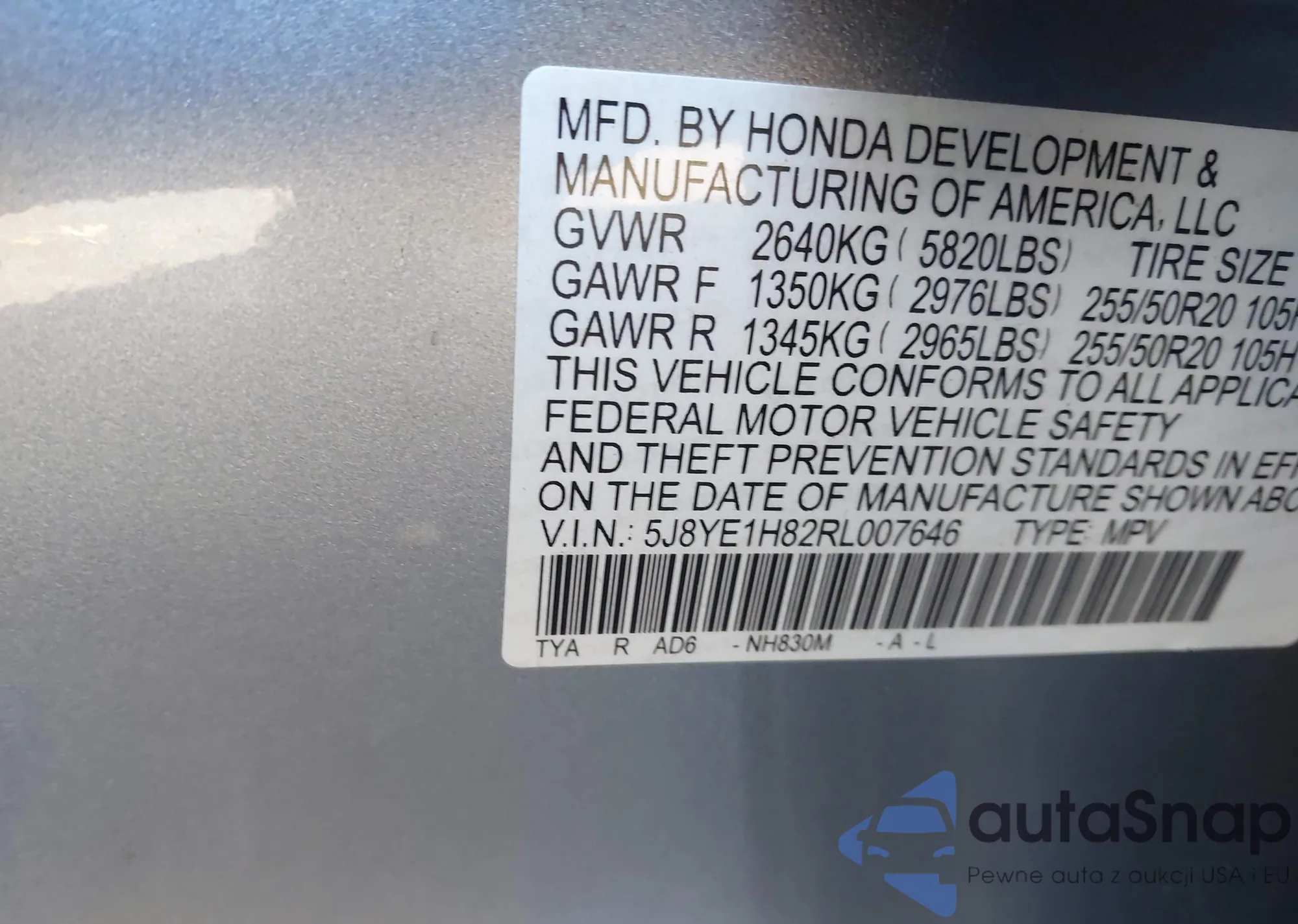 • VIN 5J8YE1H82RL007646