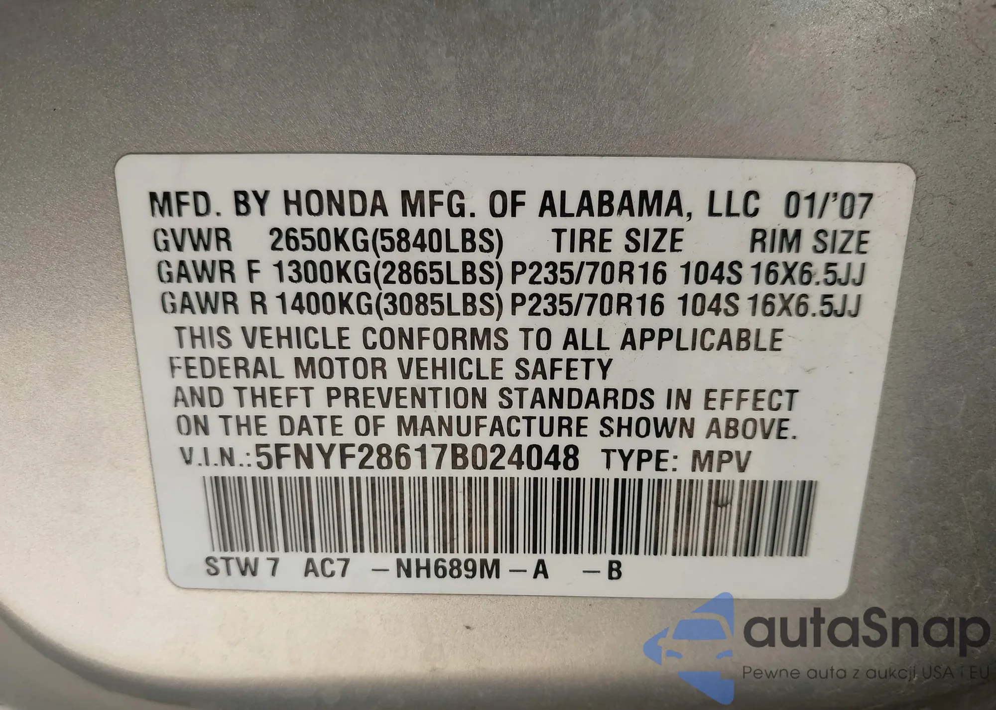 LOT: 44342160 VIN: 5FNYF28617B024048