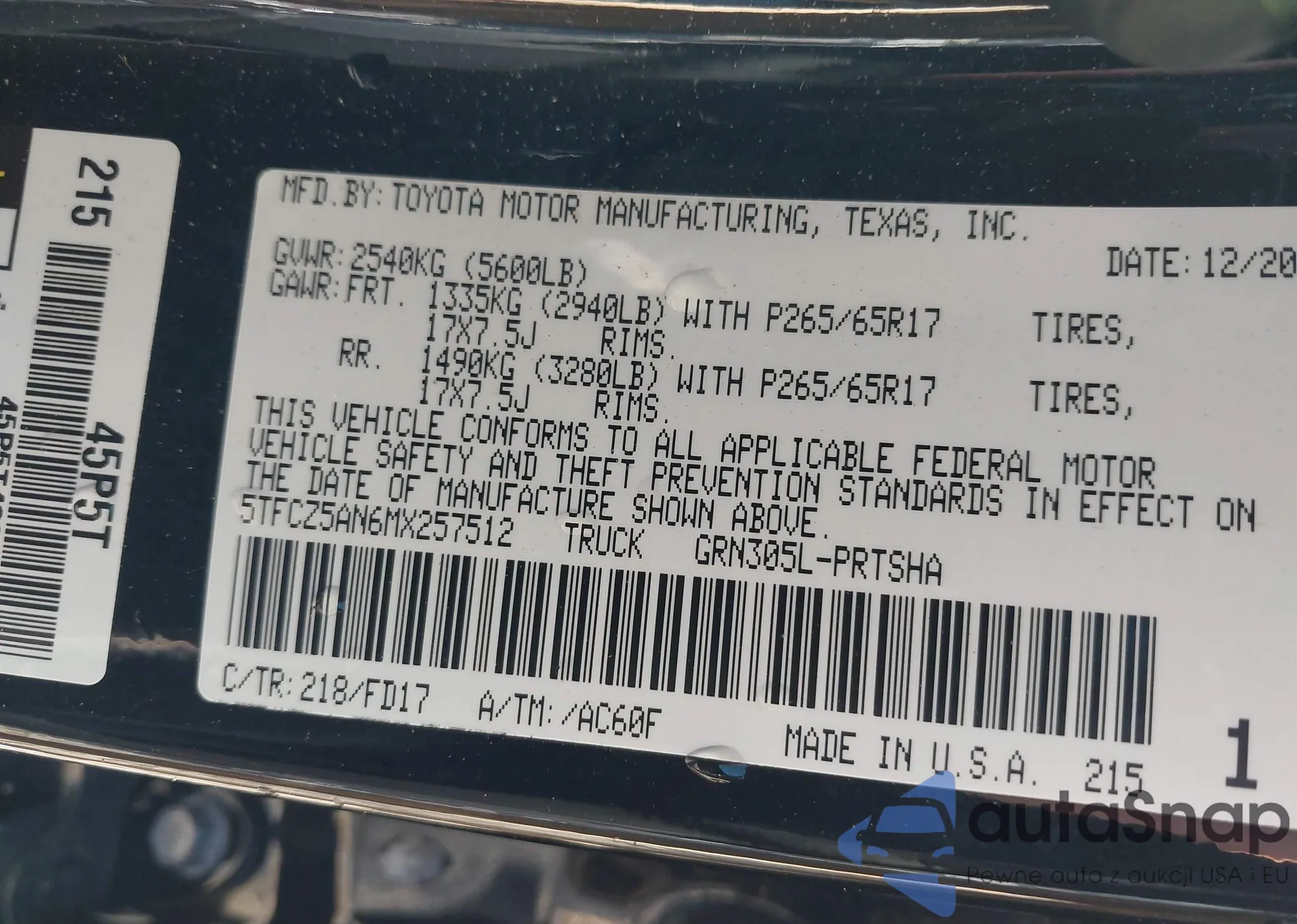 • VIN 4T1BF1FK9HU713727