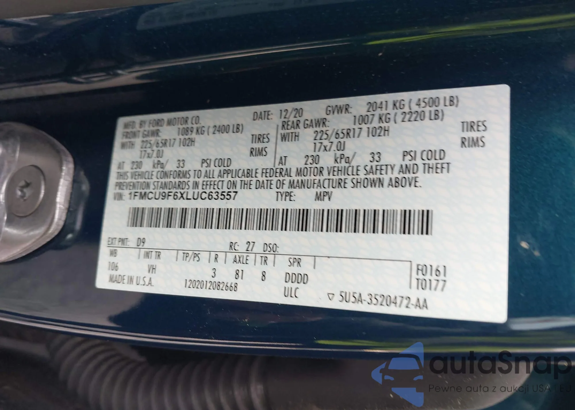 LOT: 44280128 VIN: 1FMCU9F6XLUC63557
