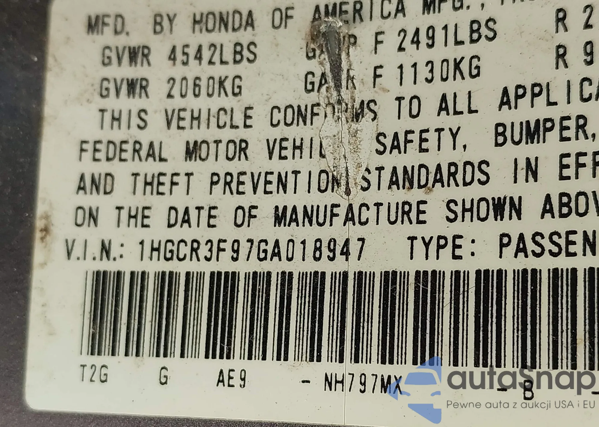 LOT: 43521949 VIN: 1HGCR3F97GA018947