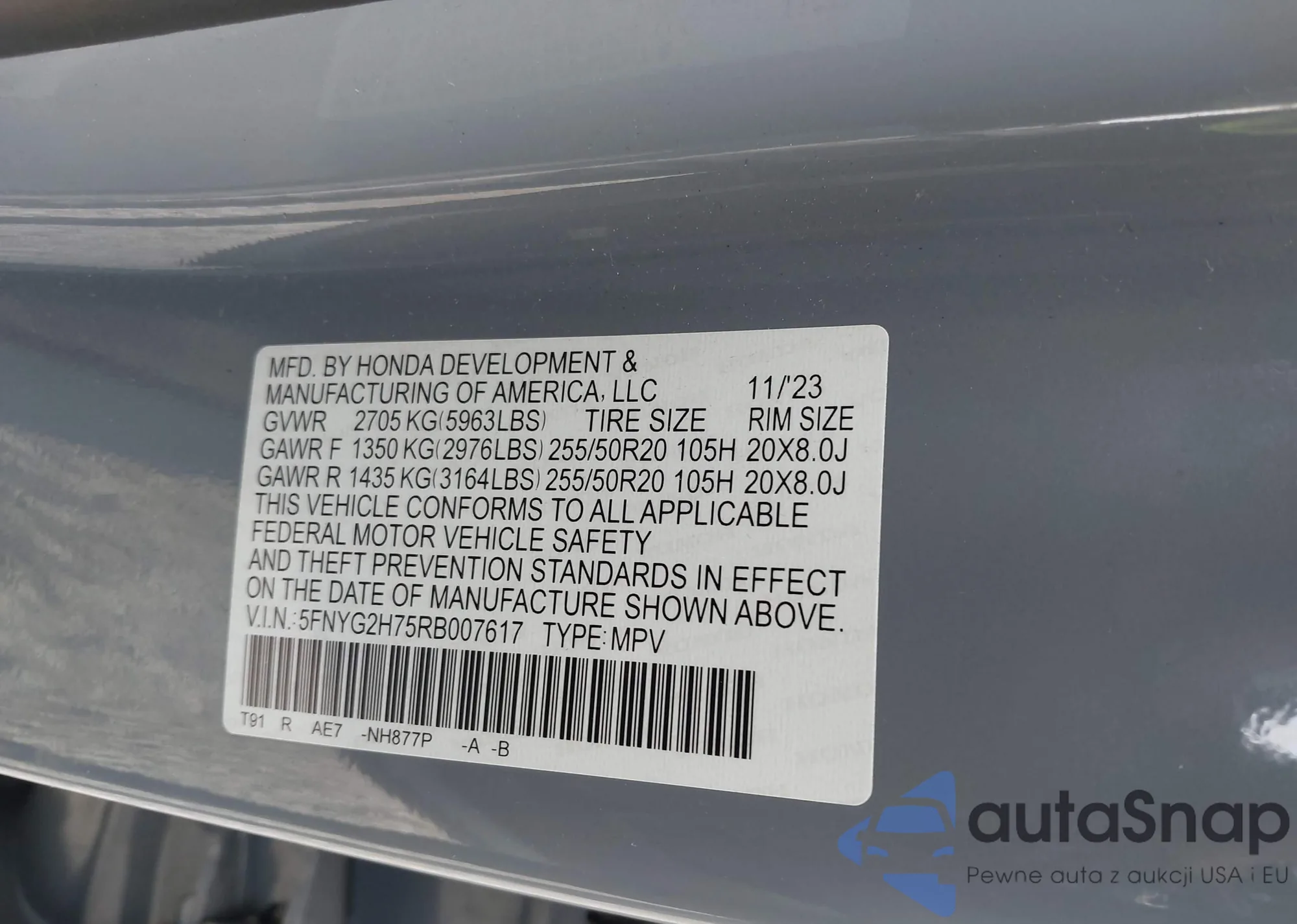 • VIN 5FNYG2H75RB007617
