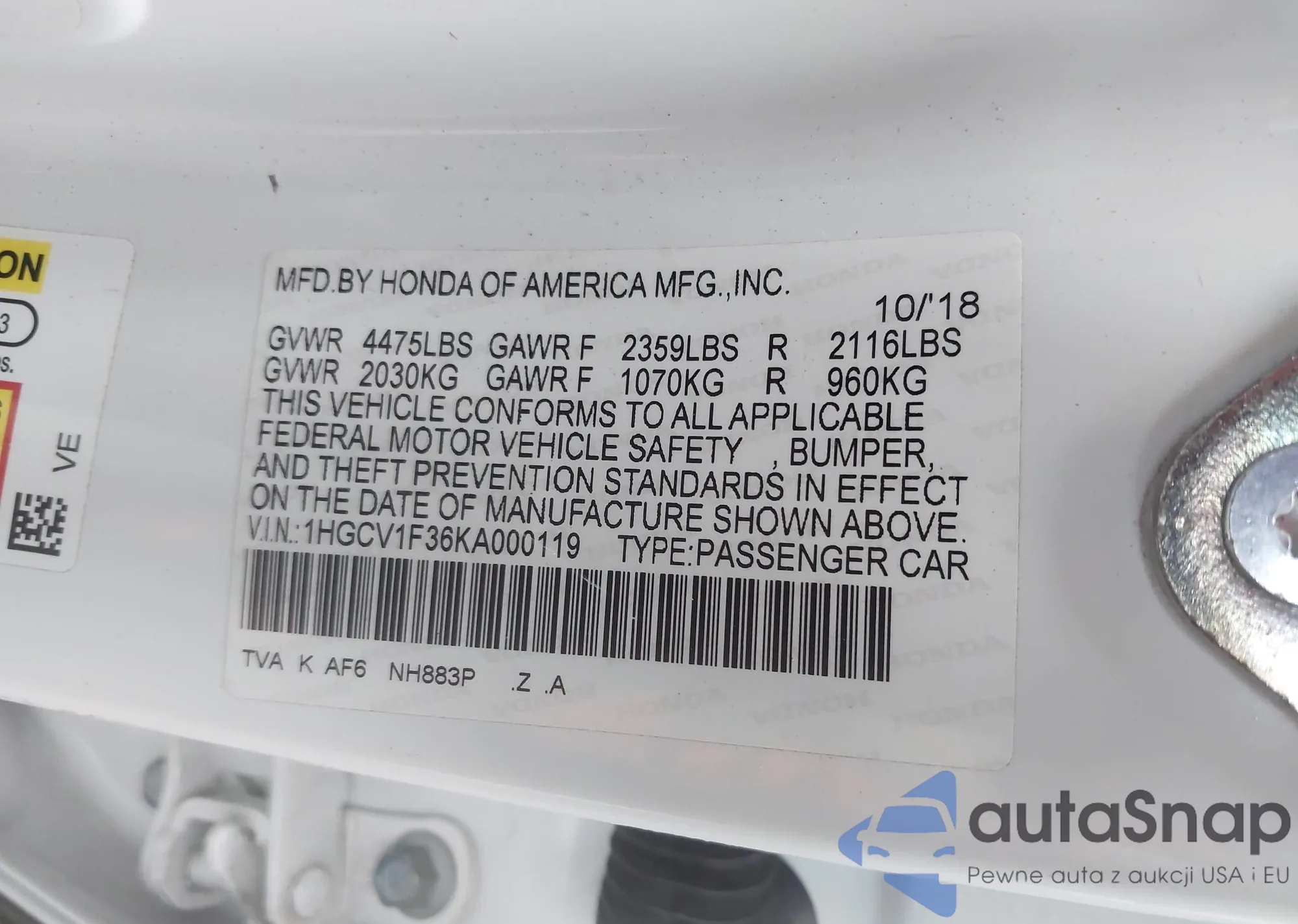 LOT: 43473343 VIN: 1HGCV1F36KA000119