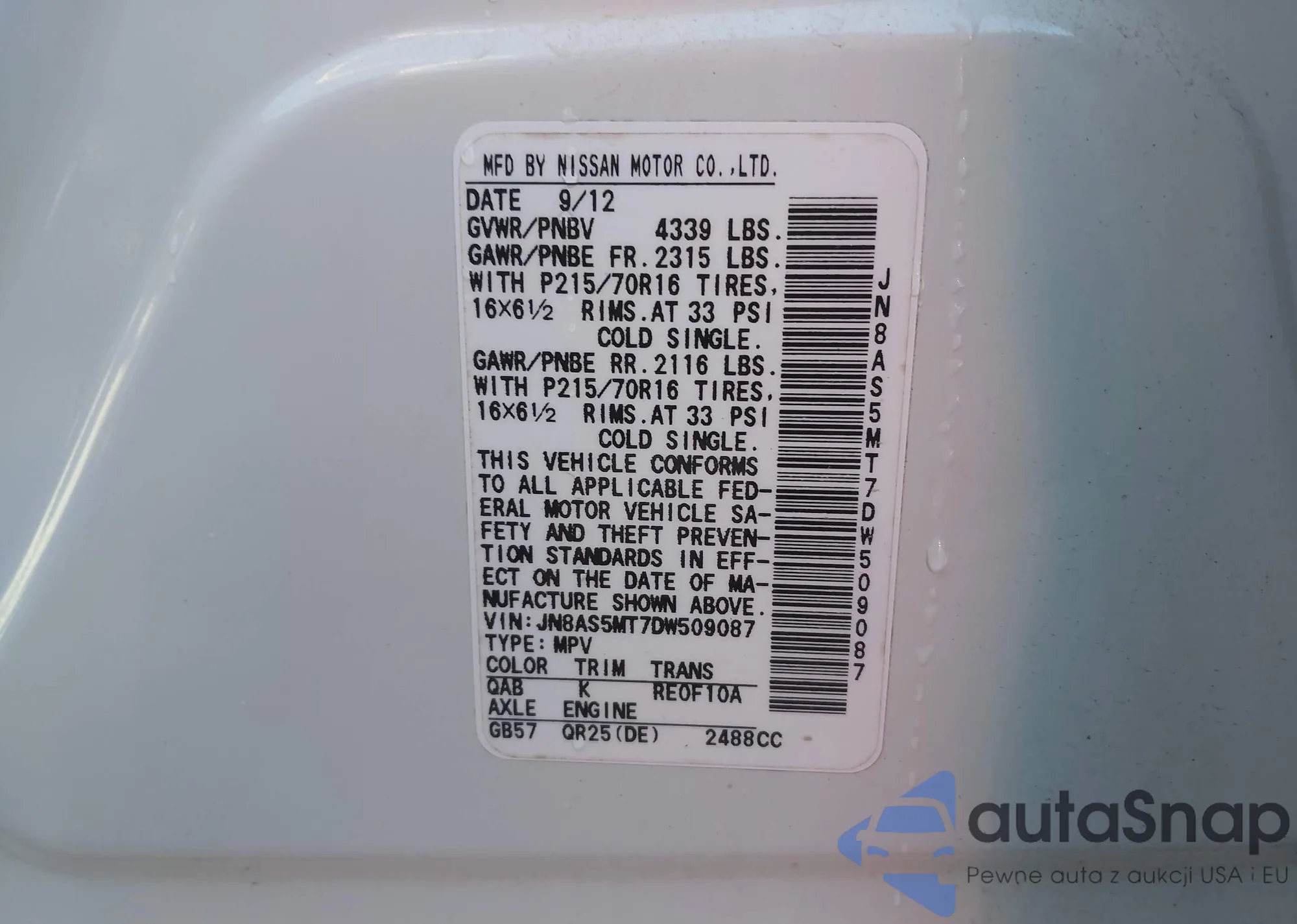 • VIN JN8AS5MT7DW509087