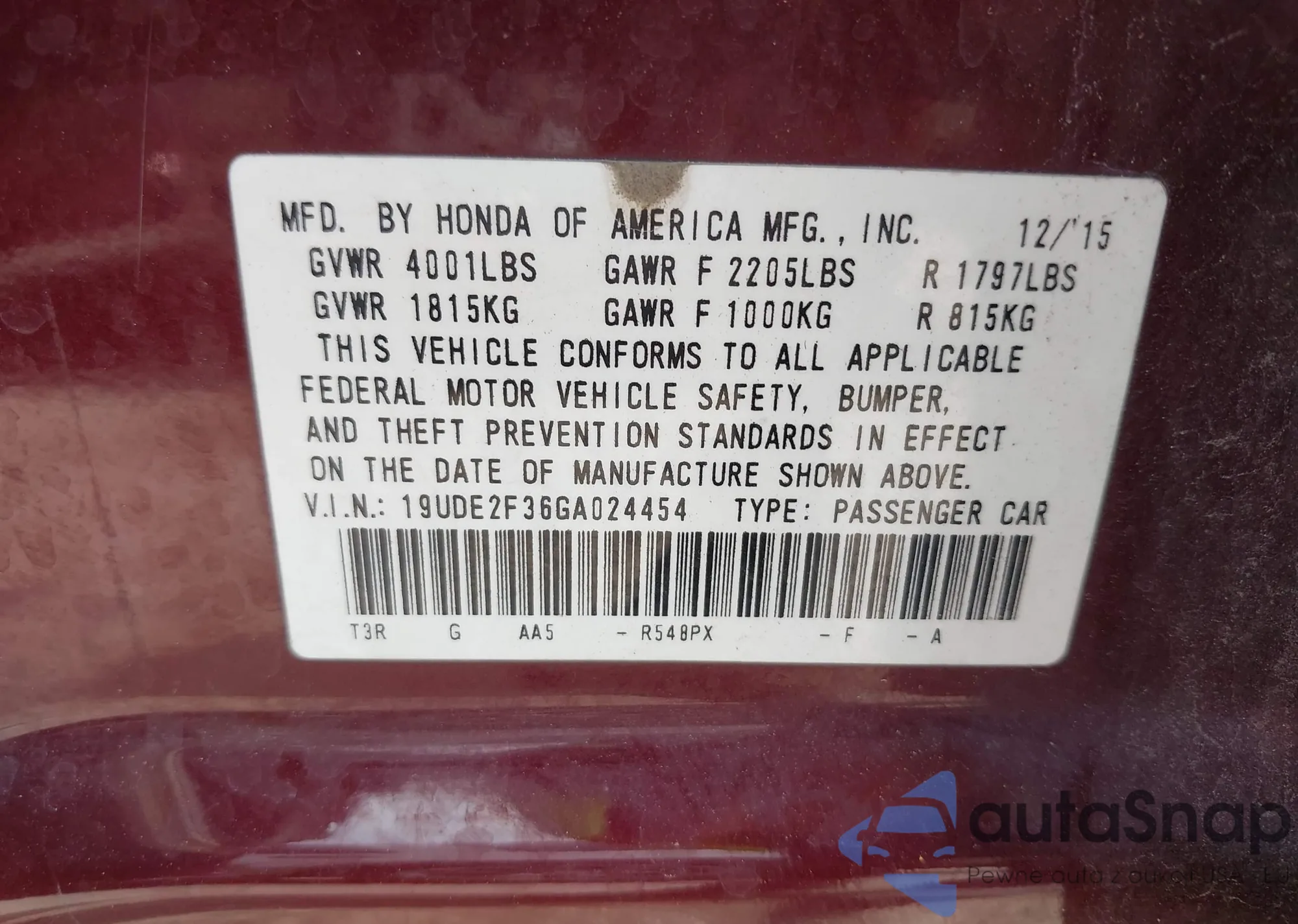 • VIN 19UDE2F36GA024454