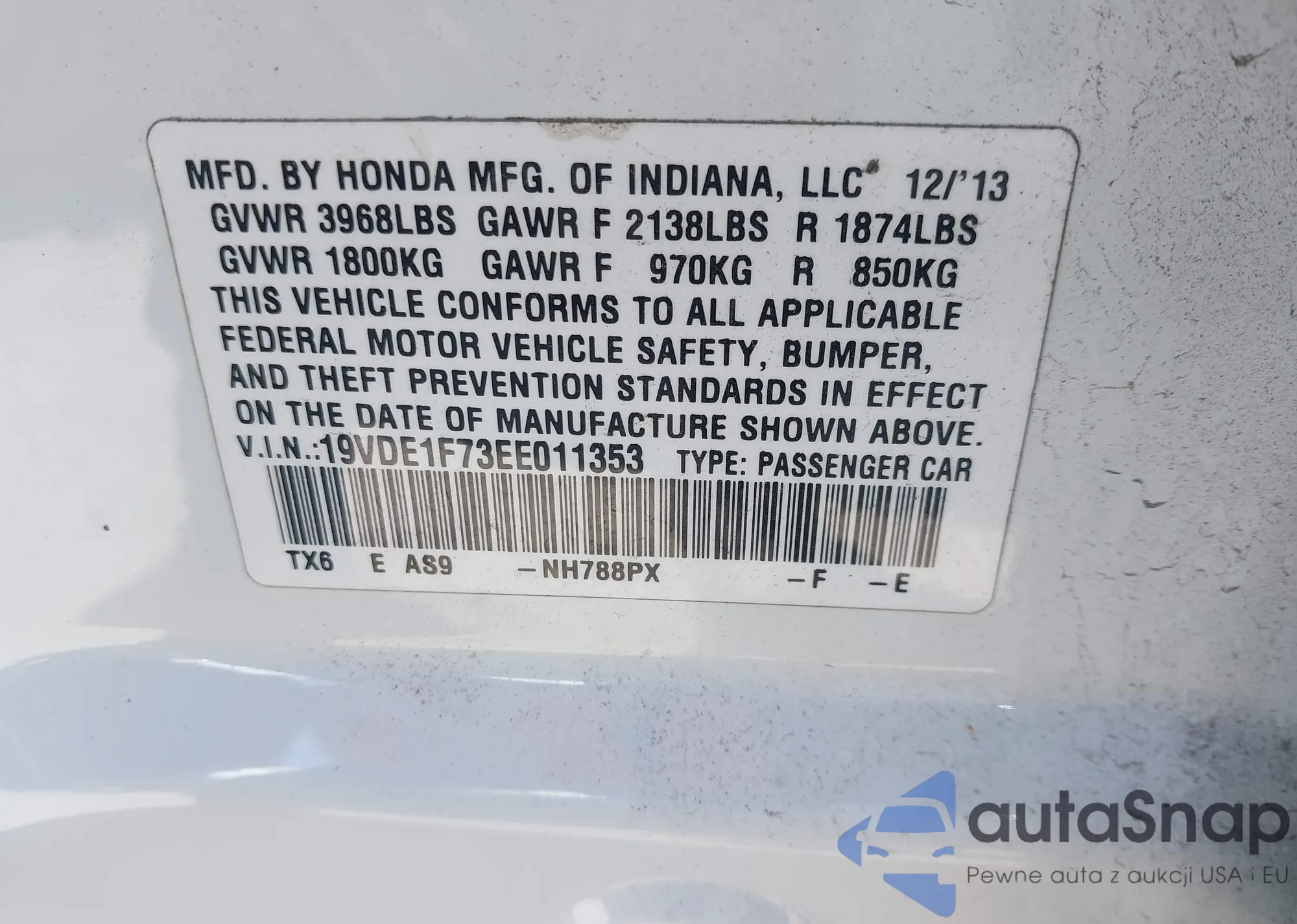 LOT: 44296058 VIN: 19VDE3F79DE300795
