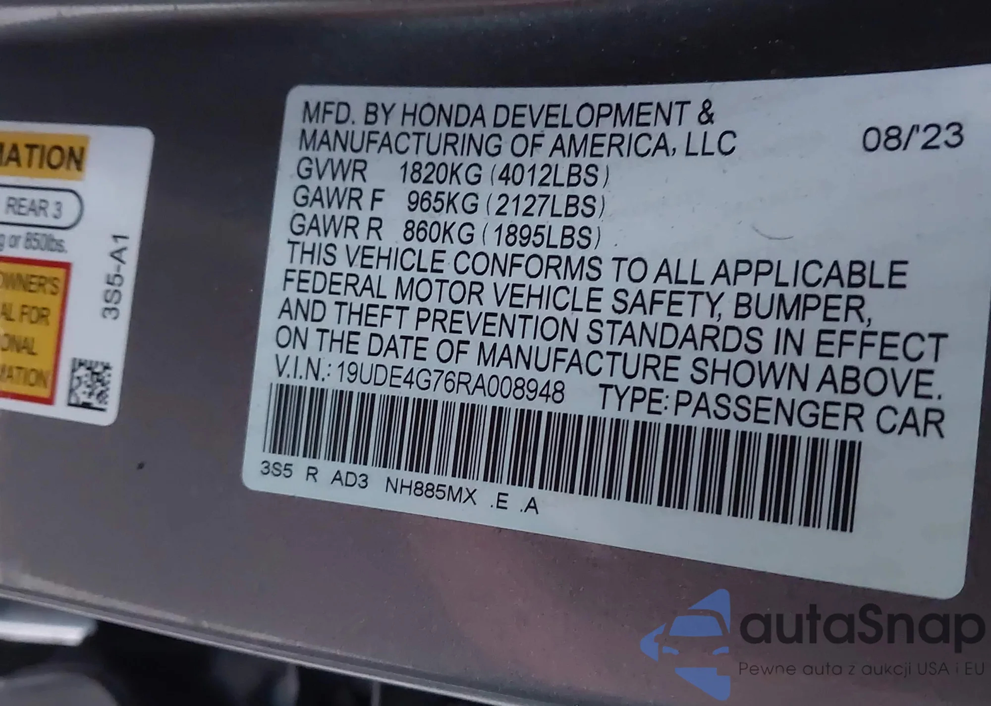 • VIN 19UDE4G76RA008948