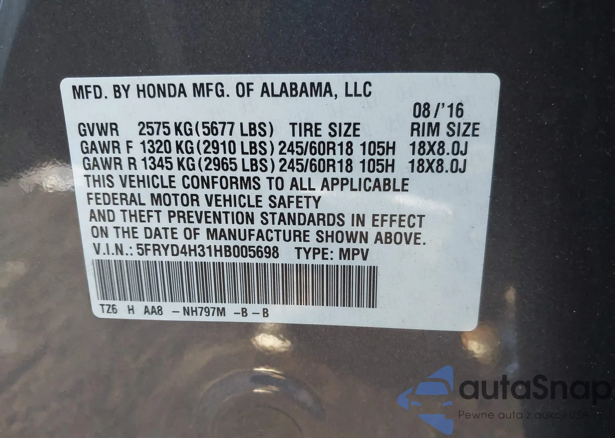 • VIN 5FRYD4H31HB005698