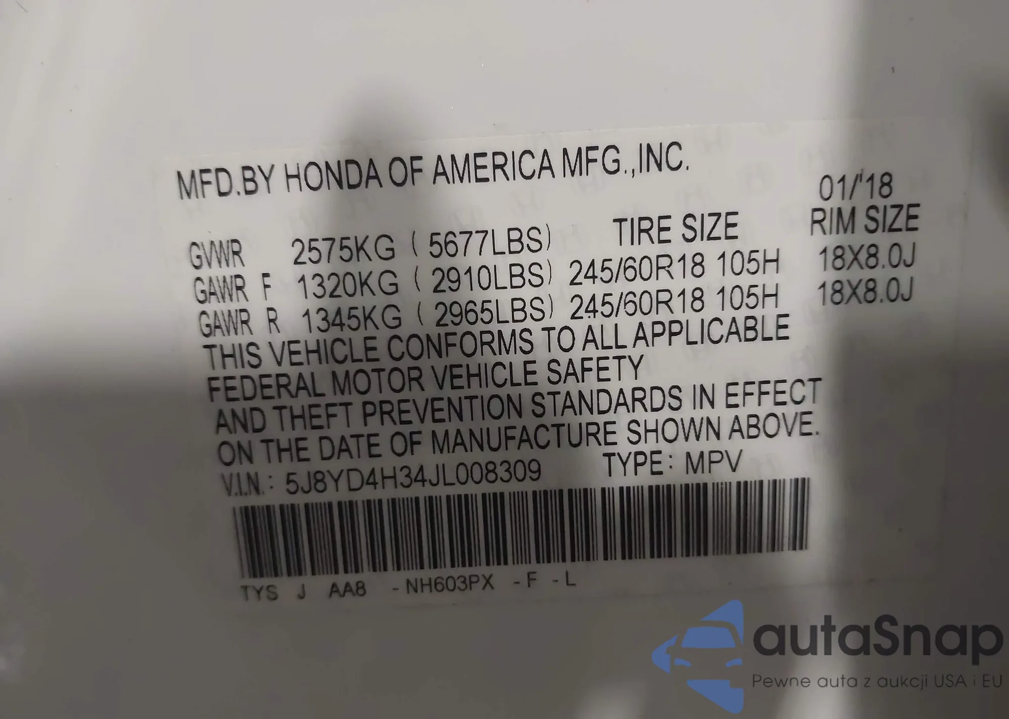 • VIN 5J8YD4H34JL008309