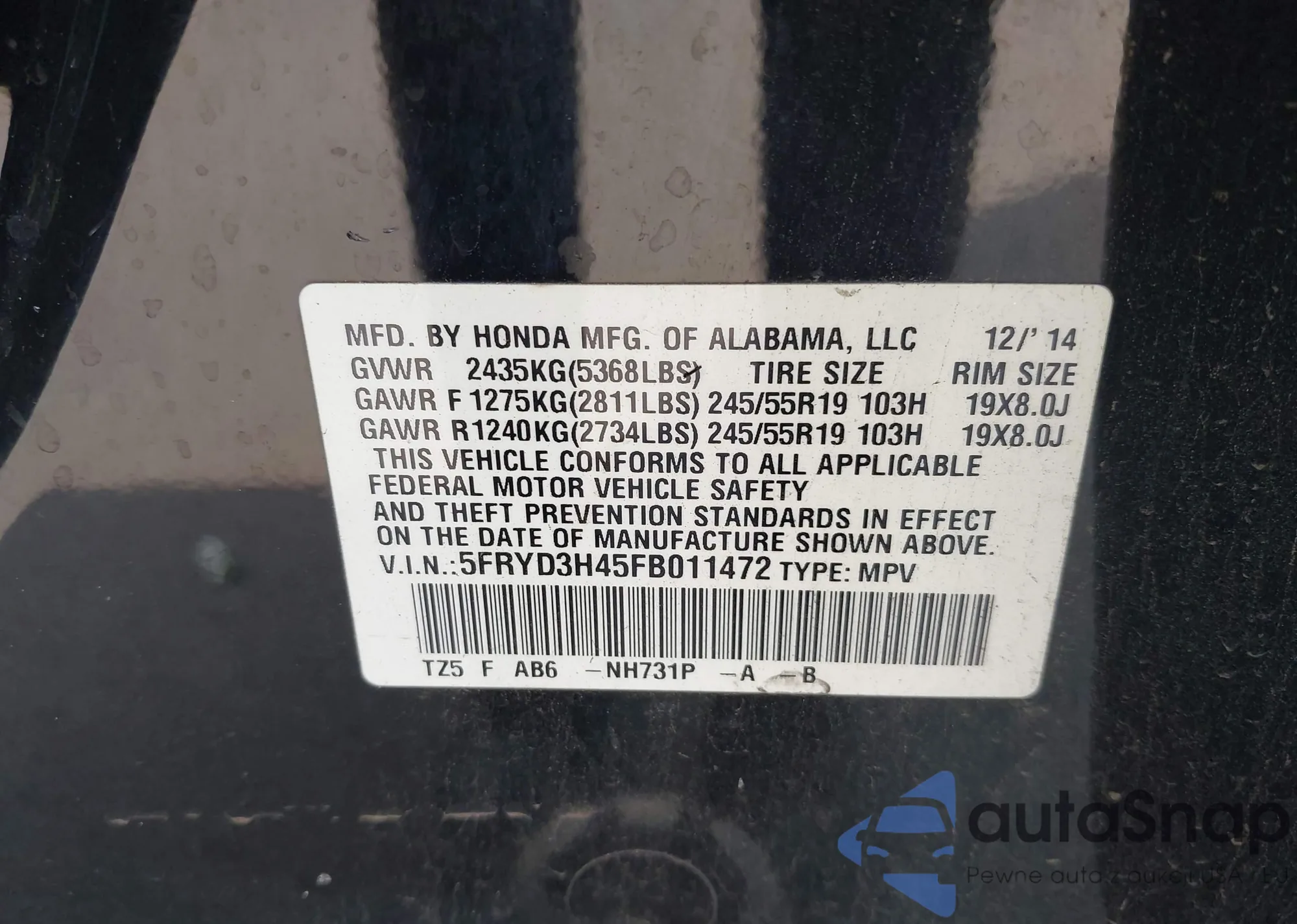 • VIN 5FRYD3H45FB011472