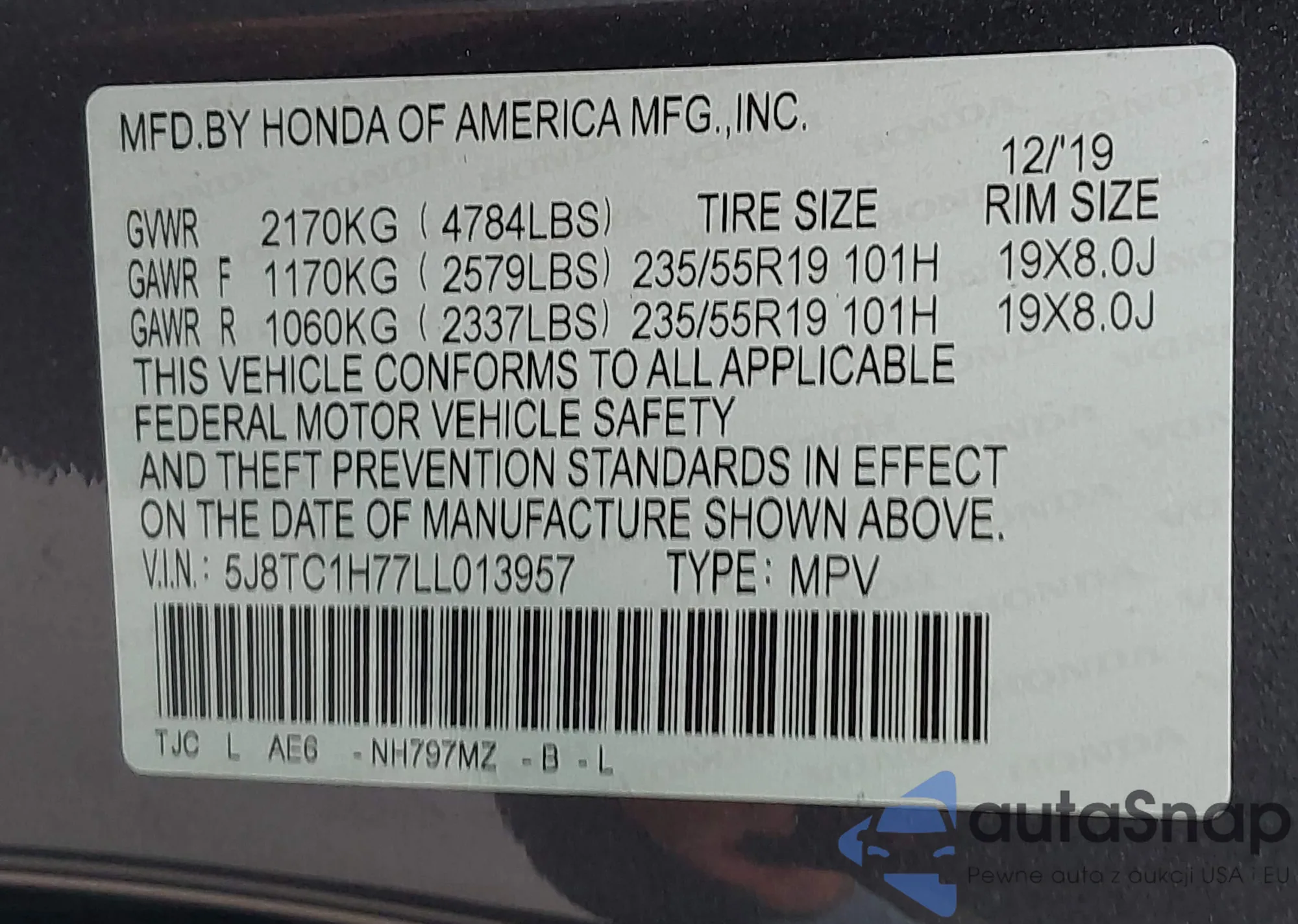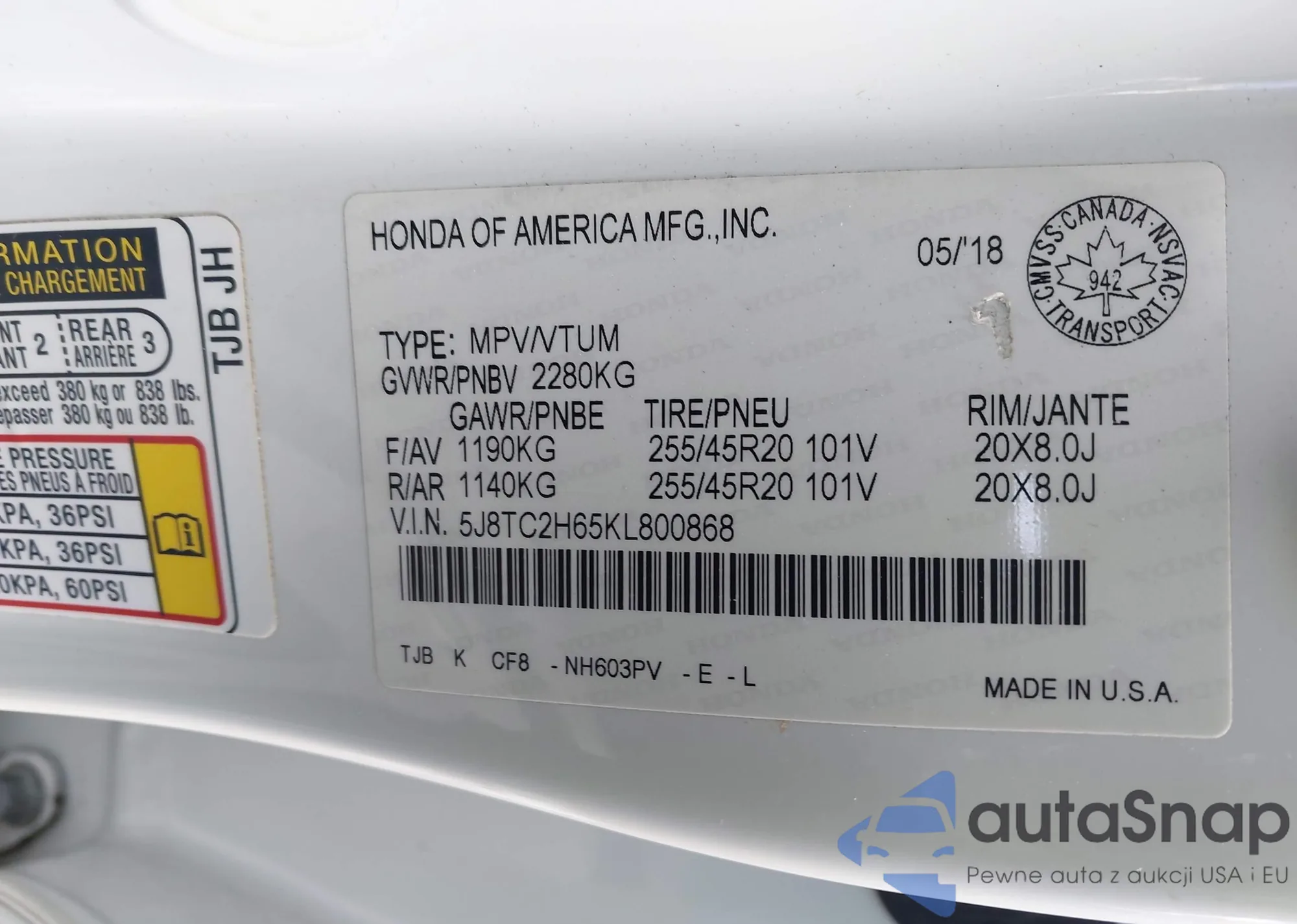 • VIN 5J8TC2H65KL800868