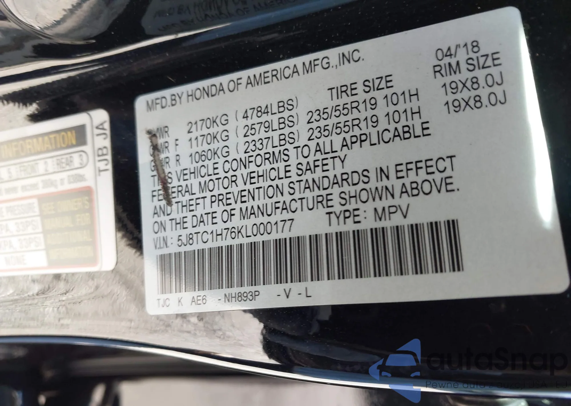 • VIN 5J8TC1H76KL000177