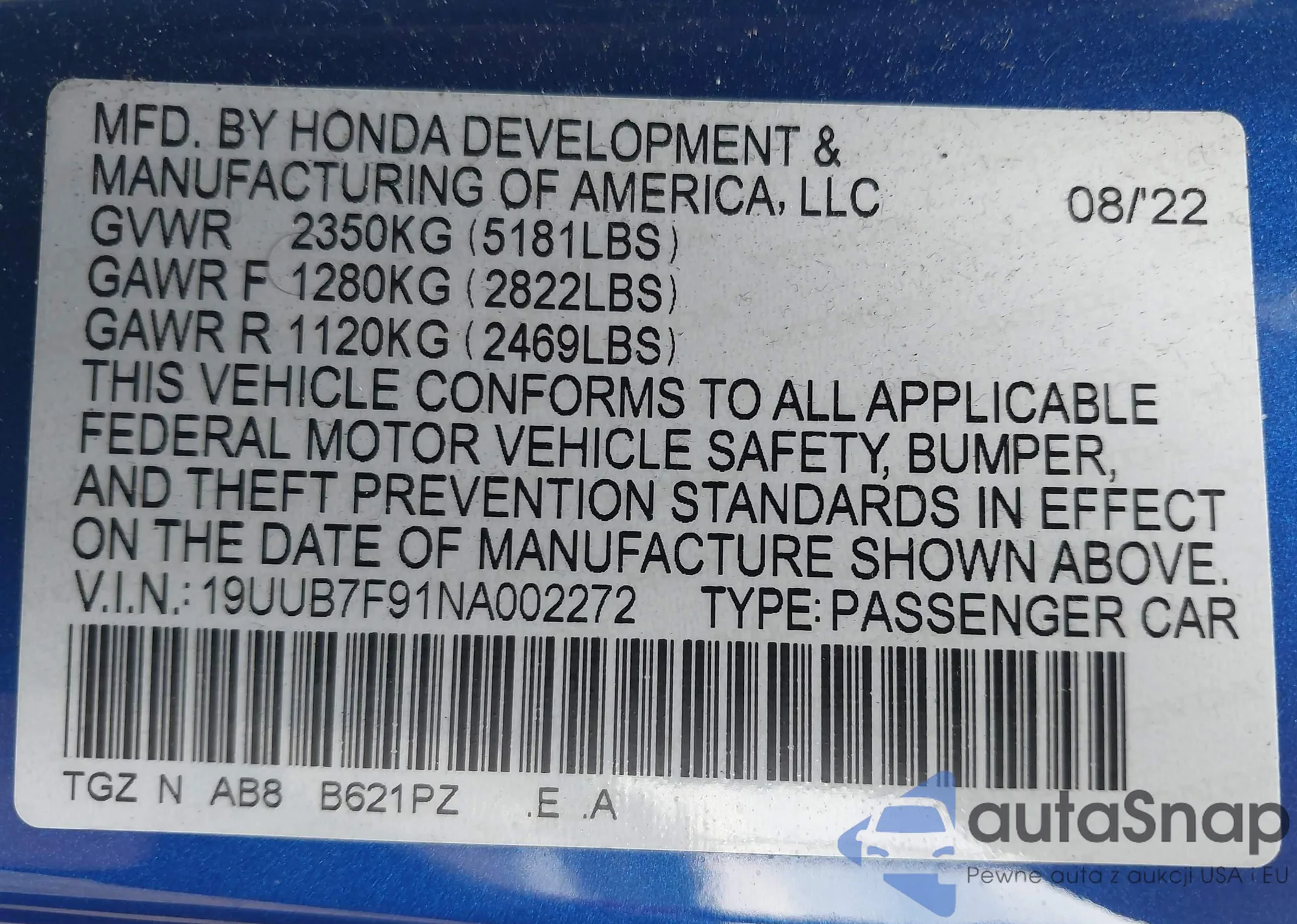 LOT: 43425391 VIN: 19UUB7F91NA002272