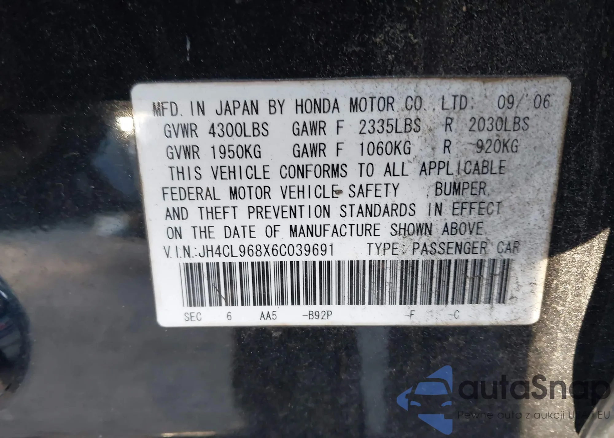 • VIN JH4CL968X6C039691