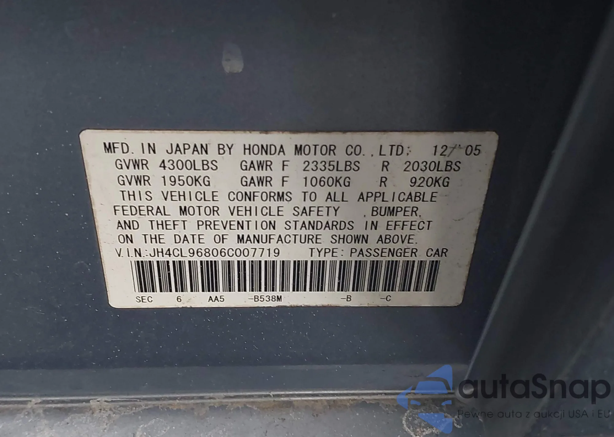 • VIN JH4CL96806C007719