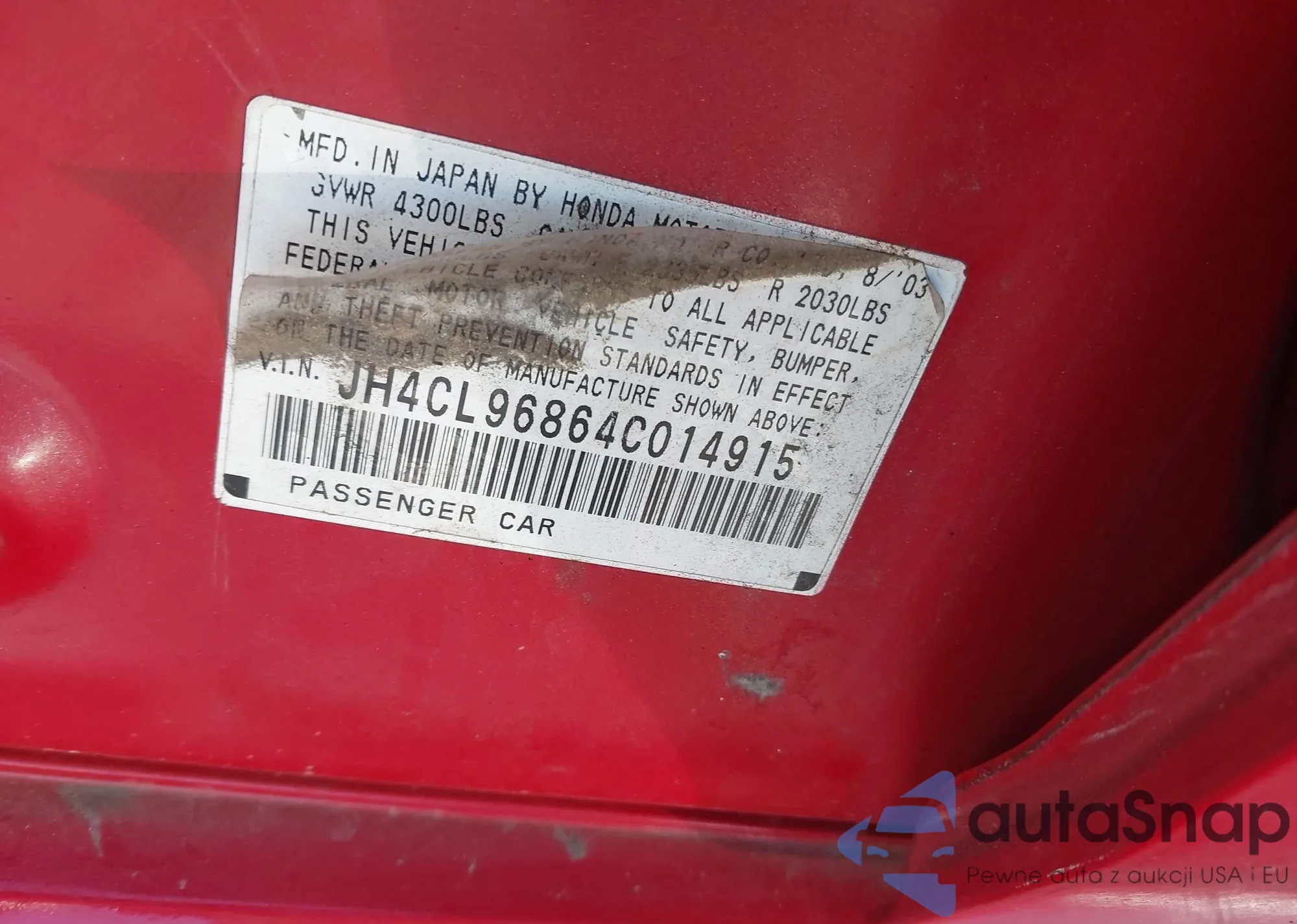 LOT: 90649165 VIN: JH4CL96874C004068