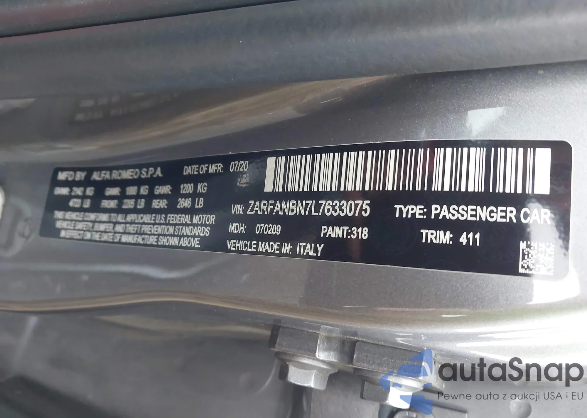 LOT: 43999472 VIN: ZARFANBN7L7633075