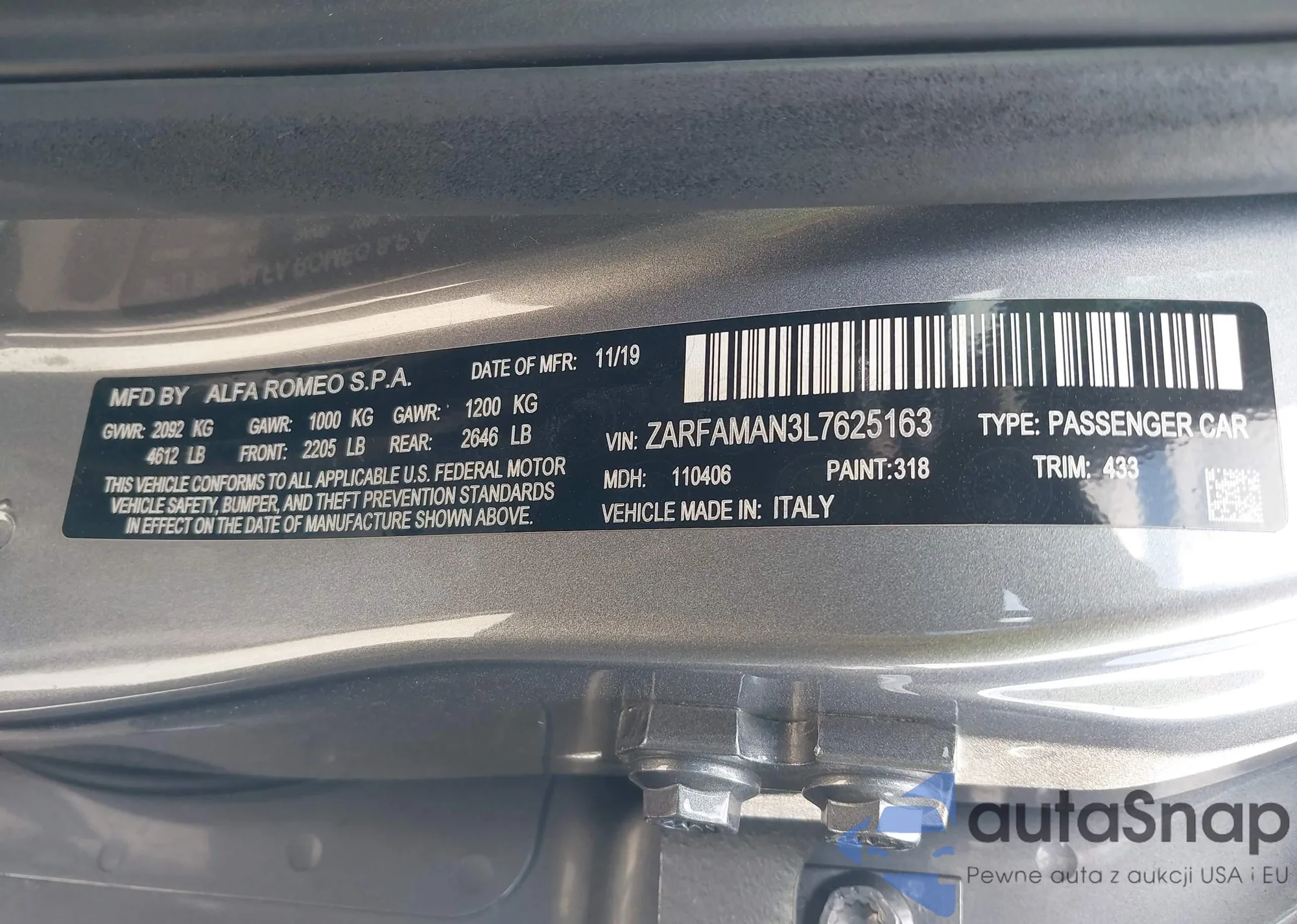LOT: 44640610 VIN: ZARFAMAN5L7630297