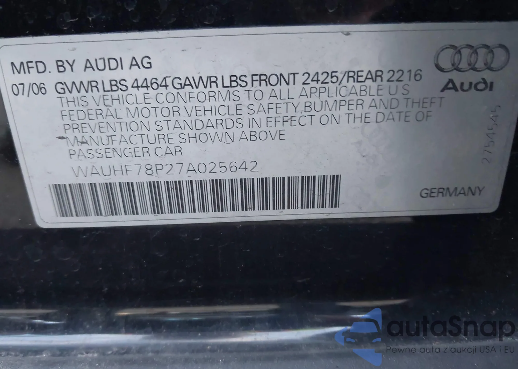 LOT: 44190905 VIN: WAUHF78P27A025642