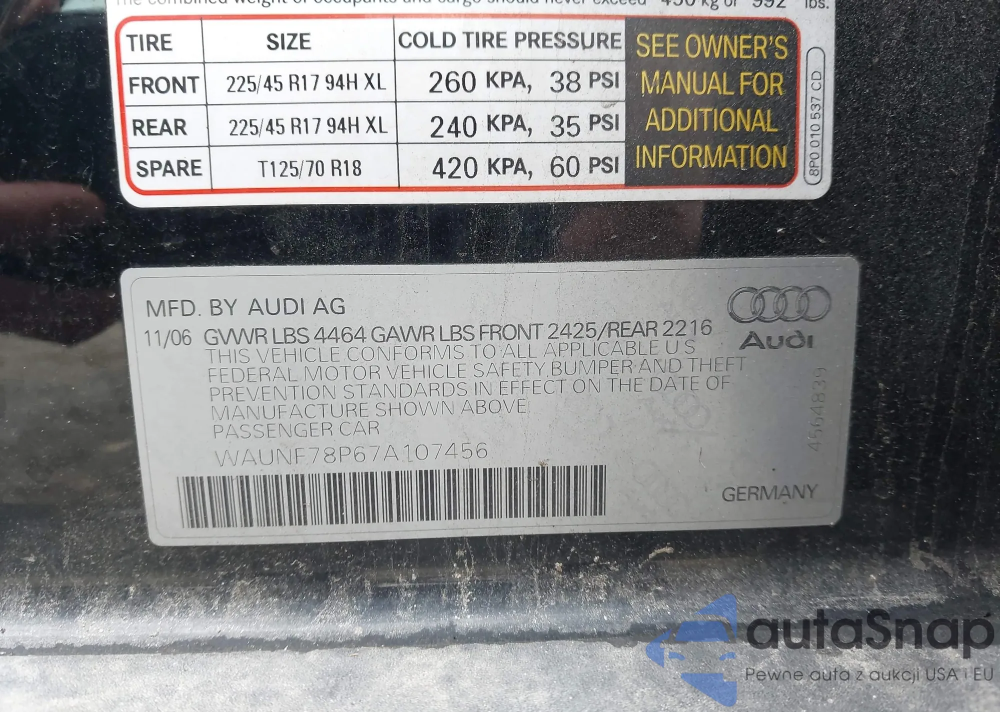LOT: 43854273 VIN: WAUNF78P67A107456
