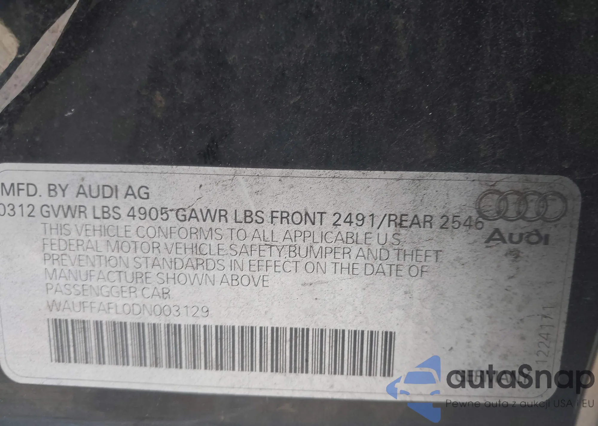 LOT: 44133546 VIN: WAUFFAFLXDN049132