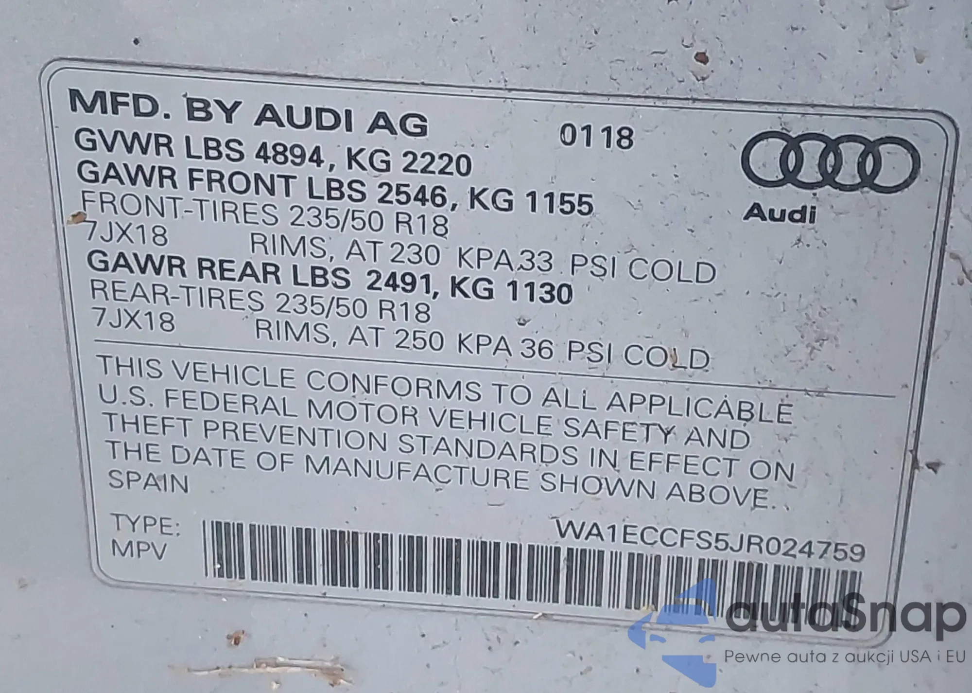 LOT: 44103294 VIN: WA1ECCFS5JR024759