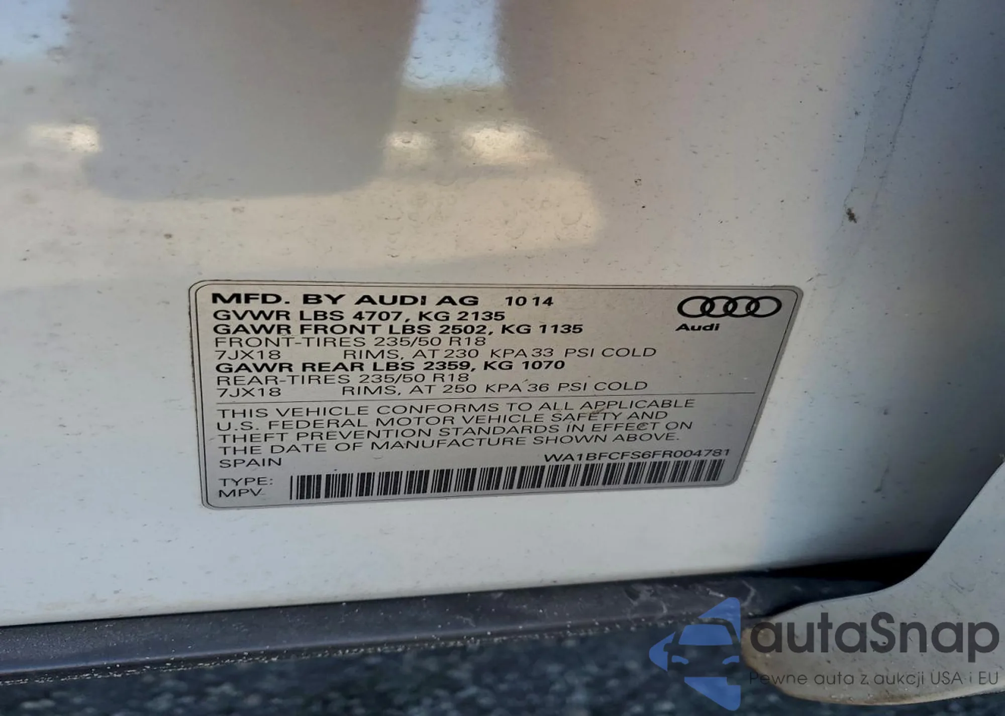 LOT: 97731295 VIN: WA1BFCFS6FR004781