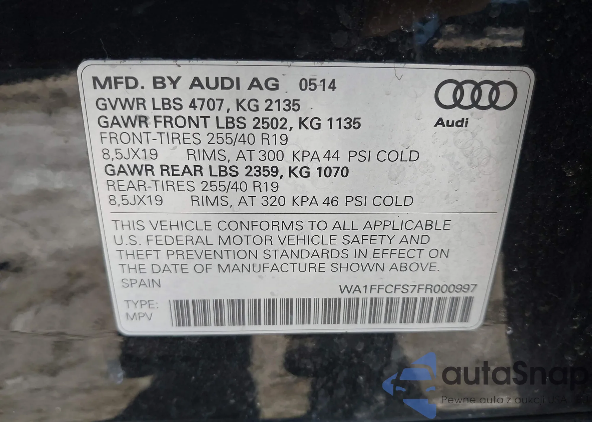 • VIN WA1FFCFS7FR000997
