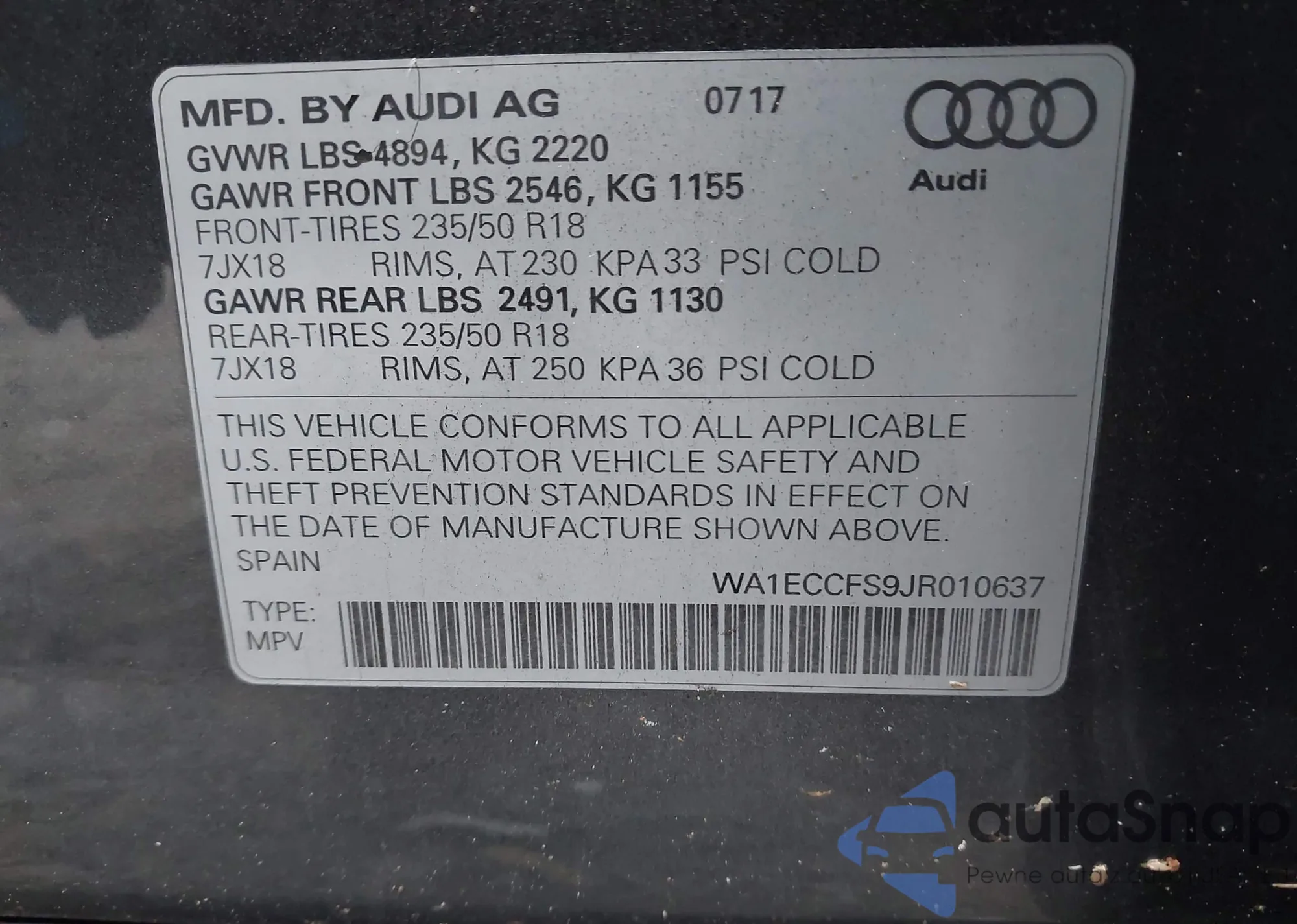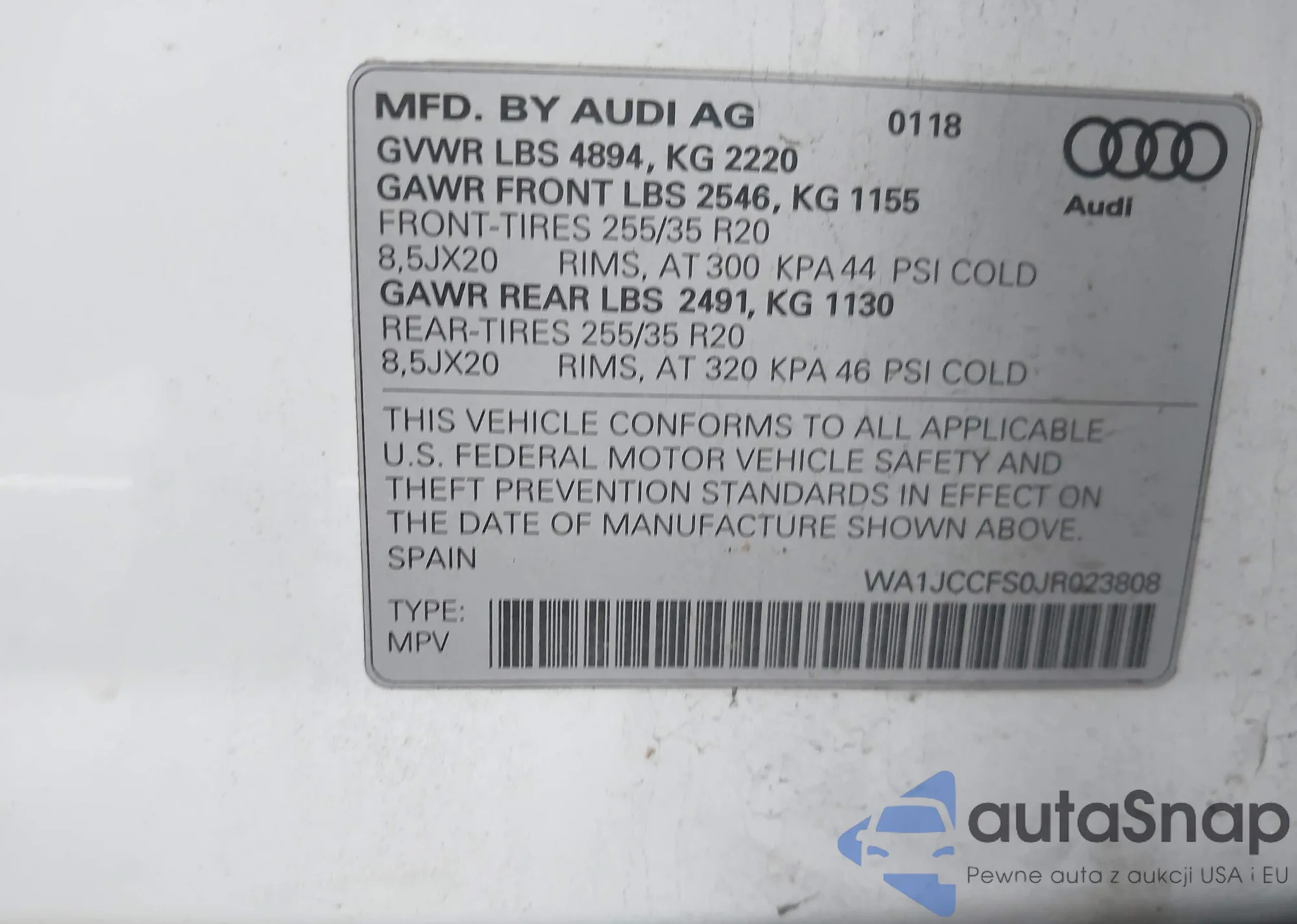 LOT: 93224205 VIN: WA1JCCFS1JR017614