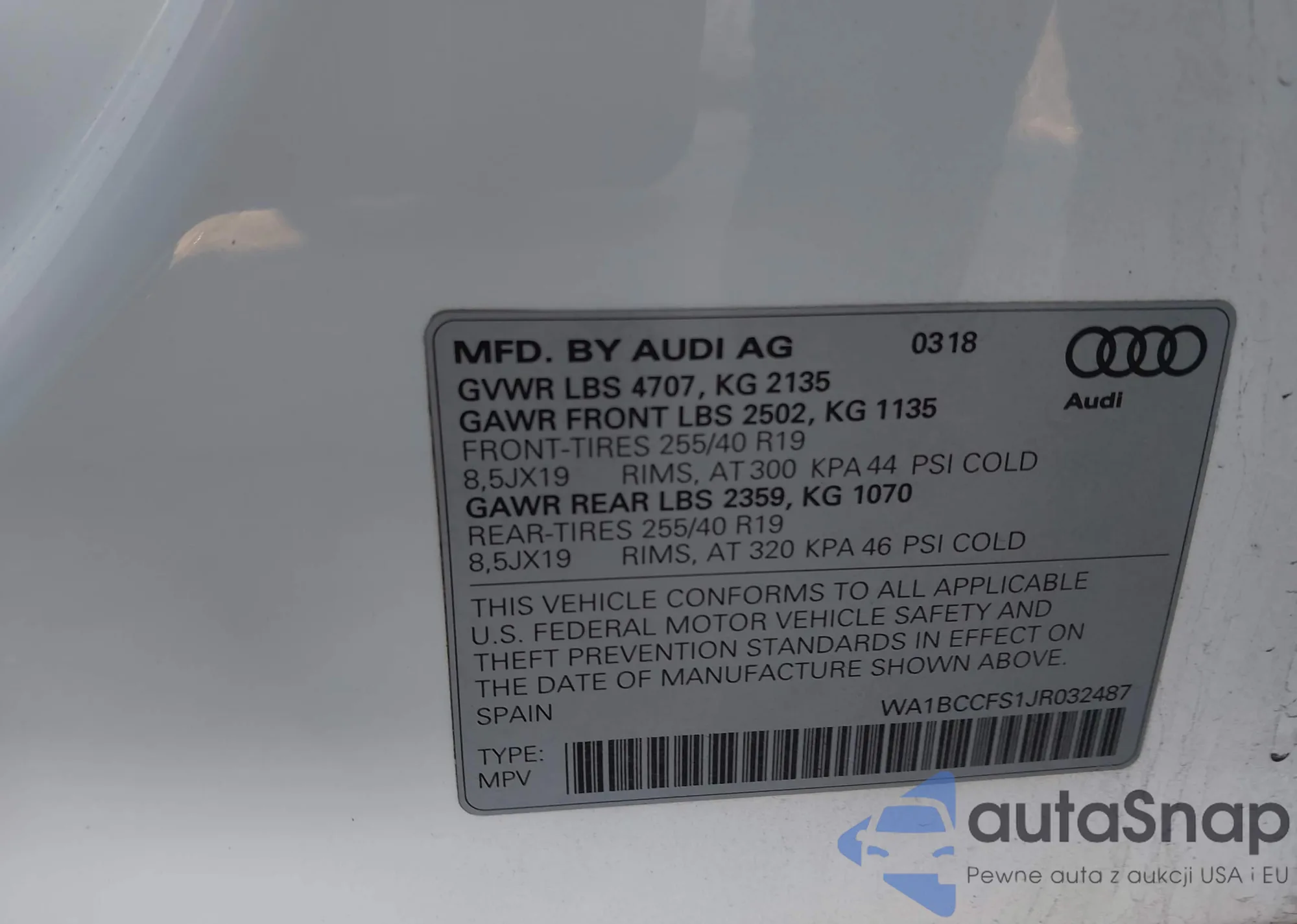 LOT: 44254401 VIN: WA1BCCFS1JR032487