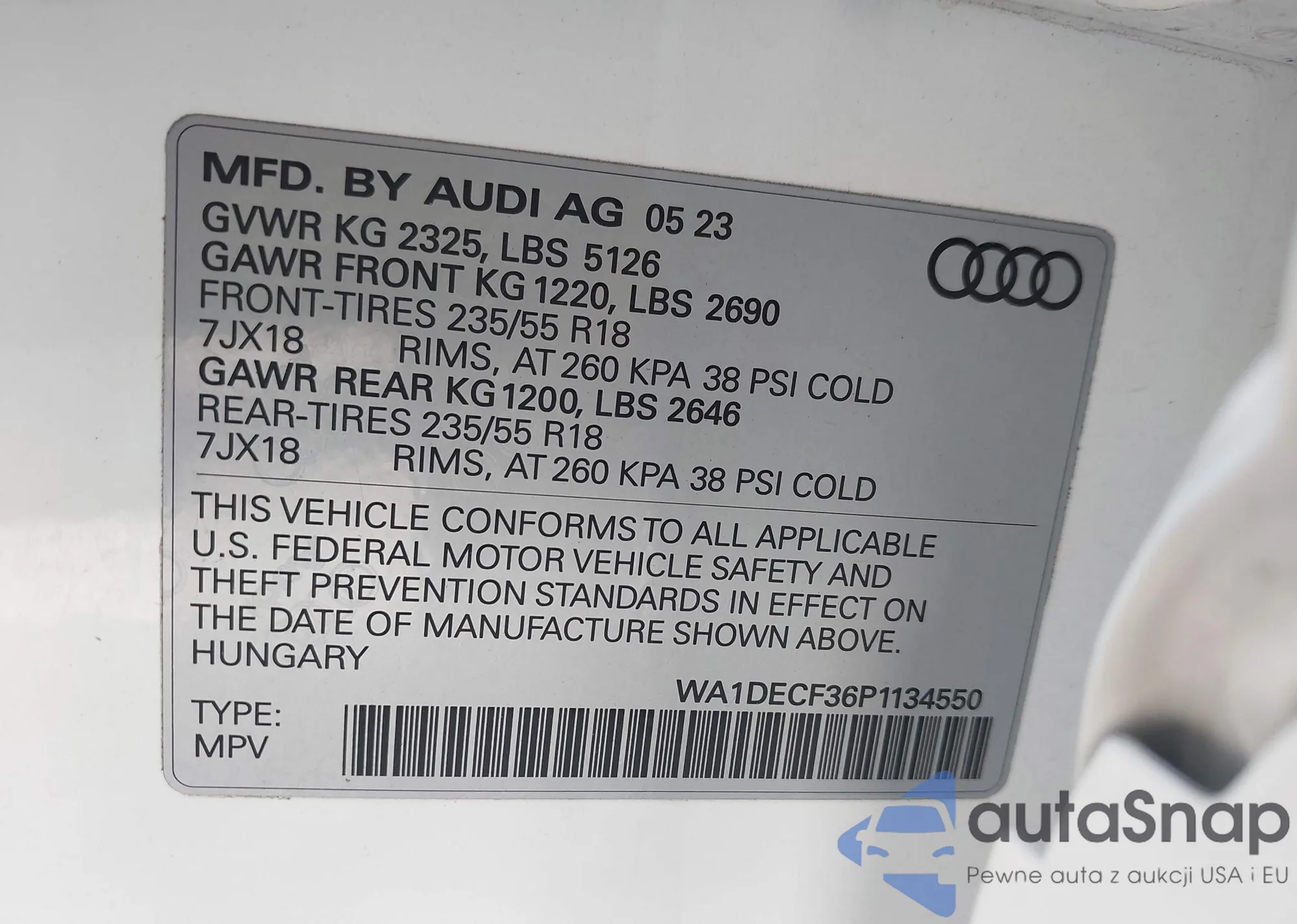 LOT: 44338435 VIN: WA1DECF36P1134550