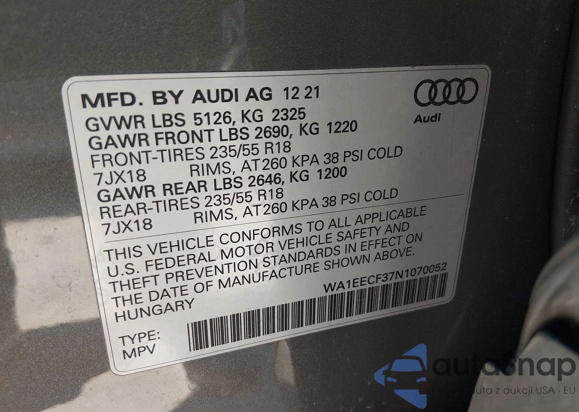 LOT: 44374431 VIN: WA1EECF37N1070052