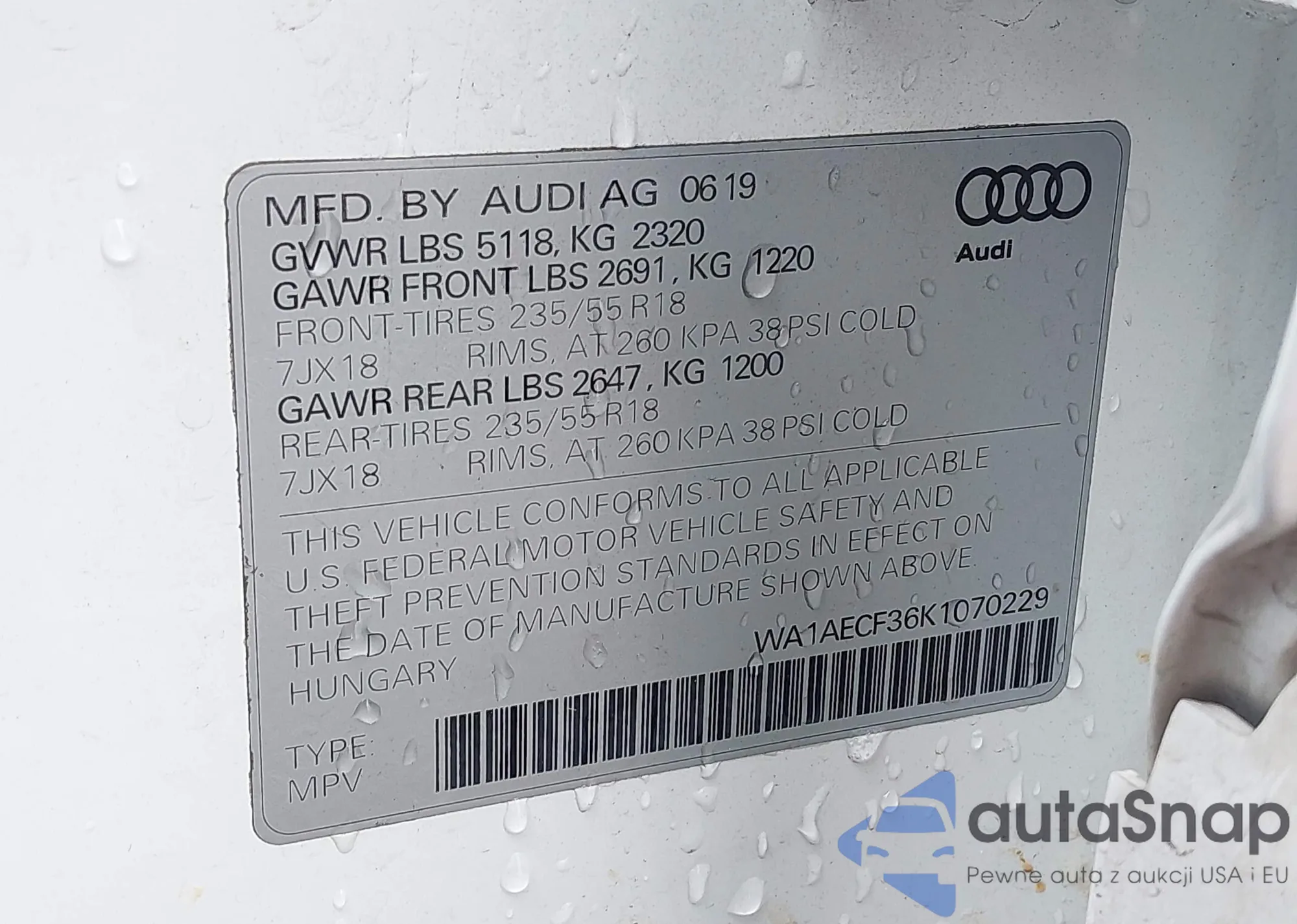 LOT: 44395321 VIN: WA1AECF36K1070229