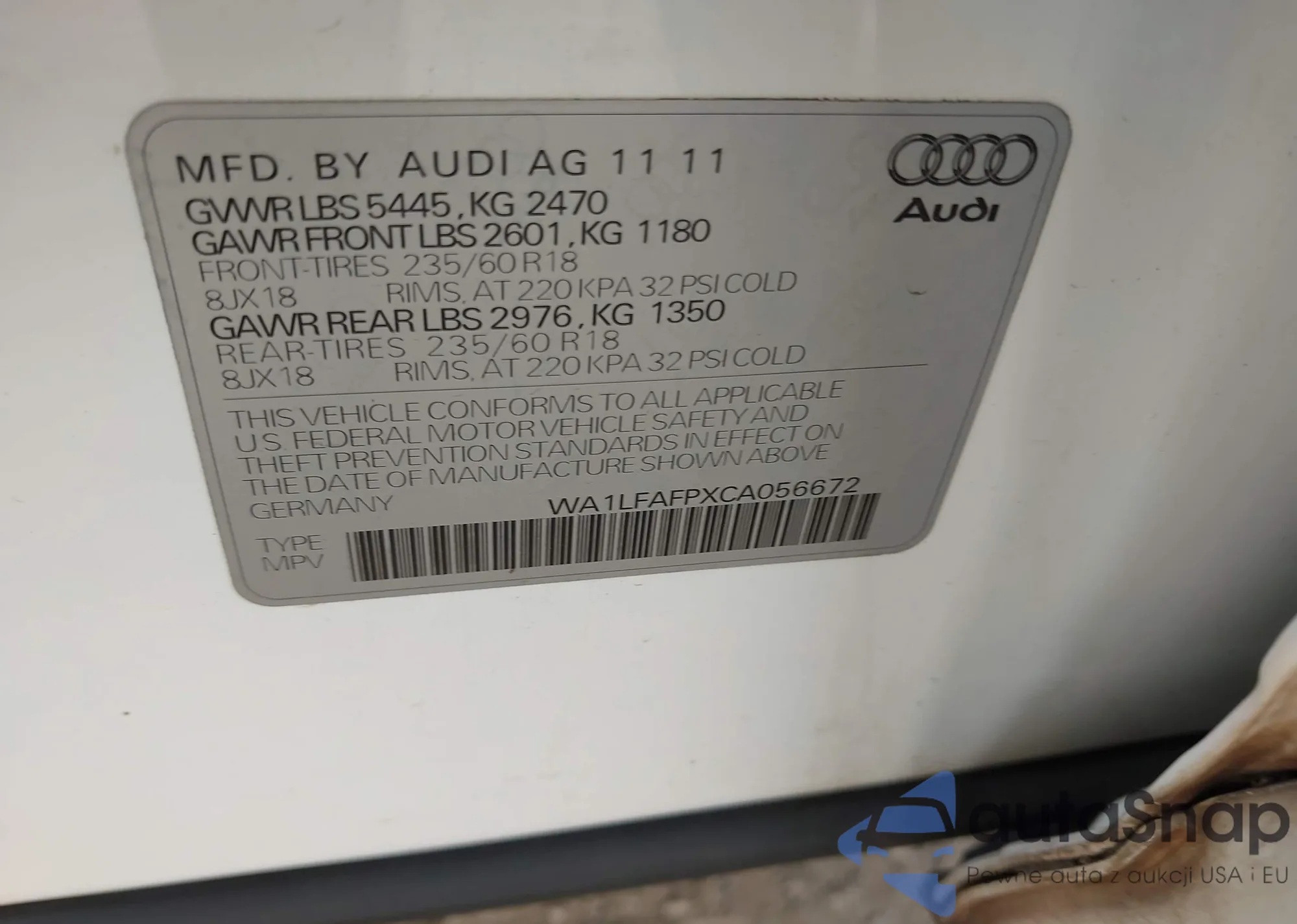 LOT: 44088131 VIN: WA1CFAFP8BA018369