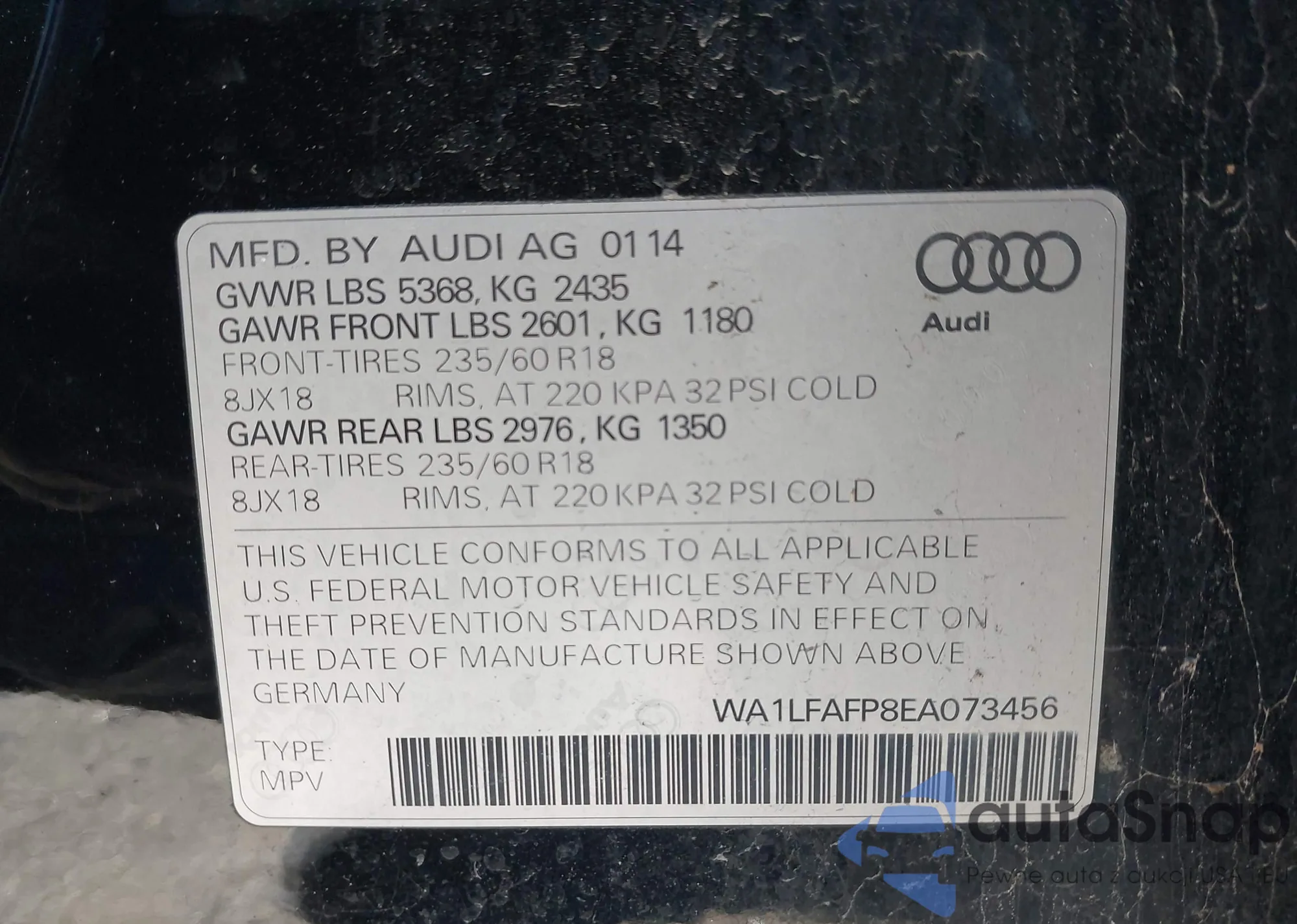 LOT: 43821238 VIN: WA1LFAFP8EA073456