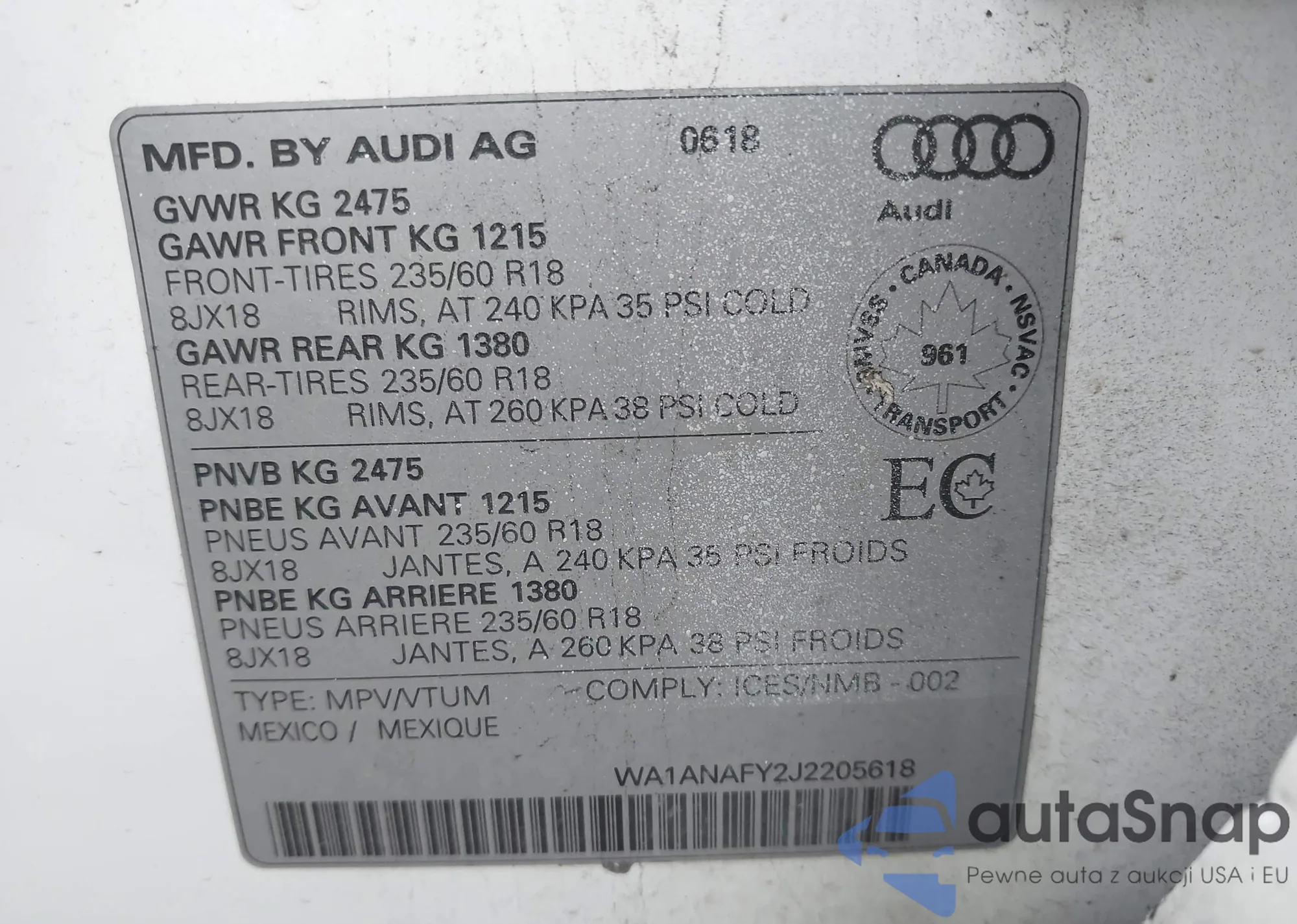 LOT: 43051748 VIN: WA1ANAFY2J2205618