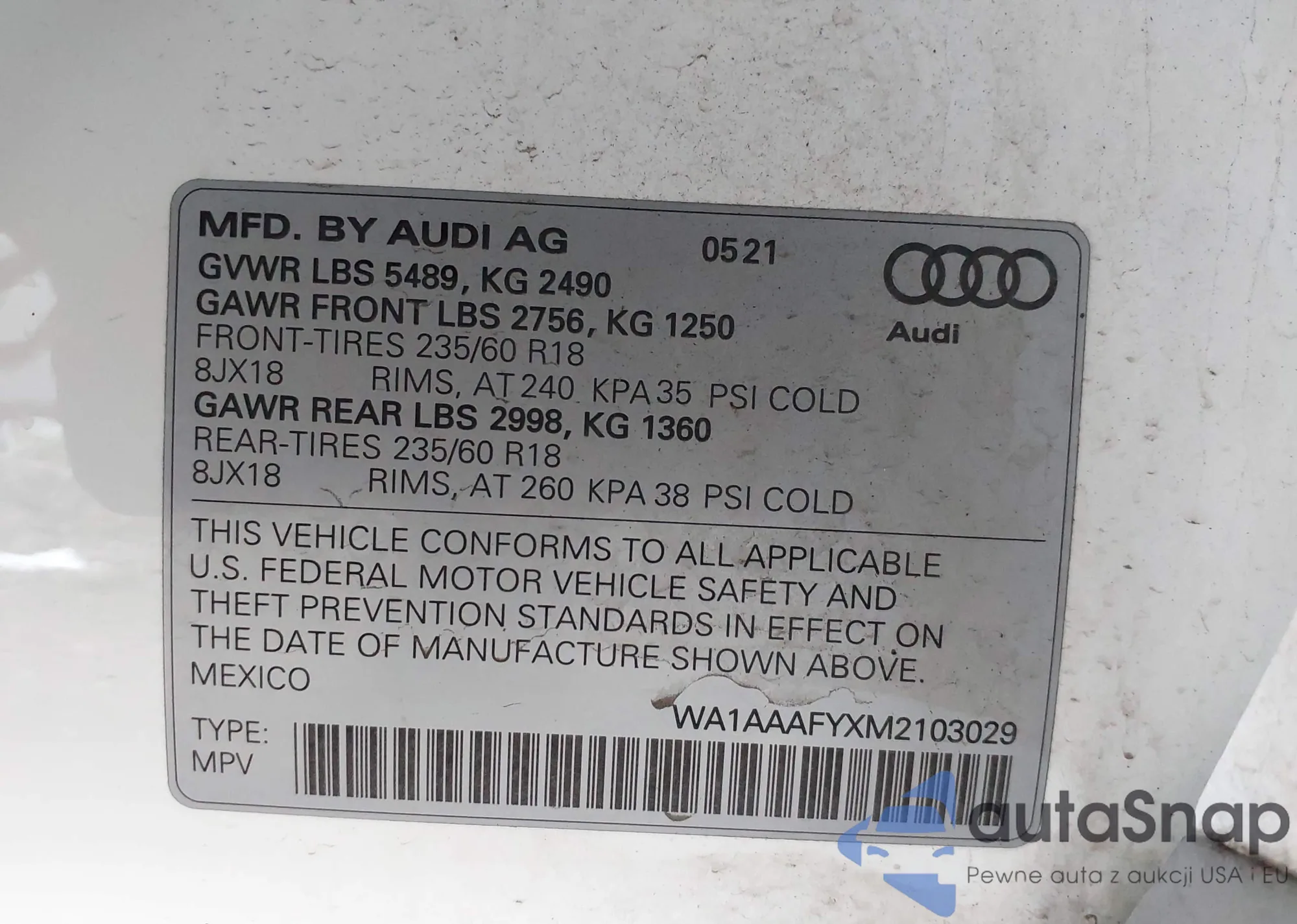 LOT: 43169234 VIN: WA1AAAFYXM2103029