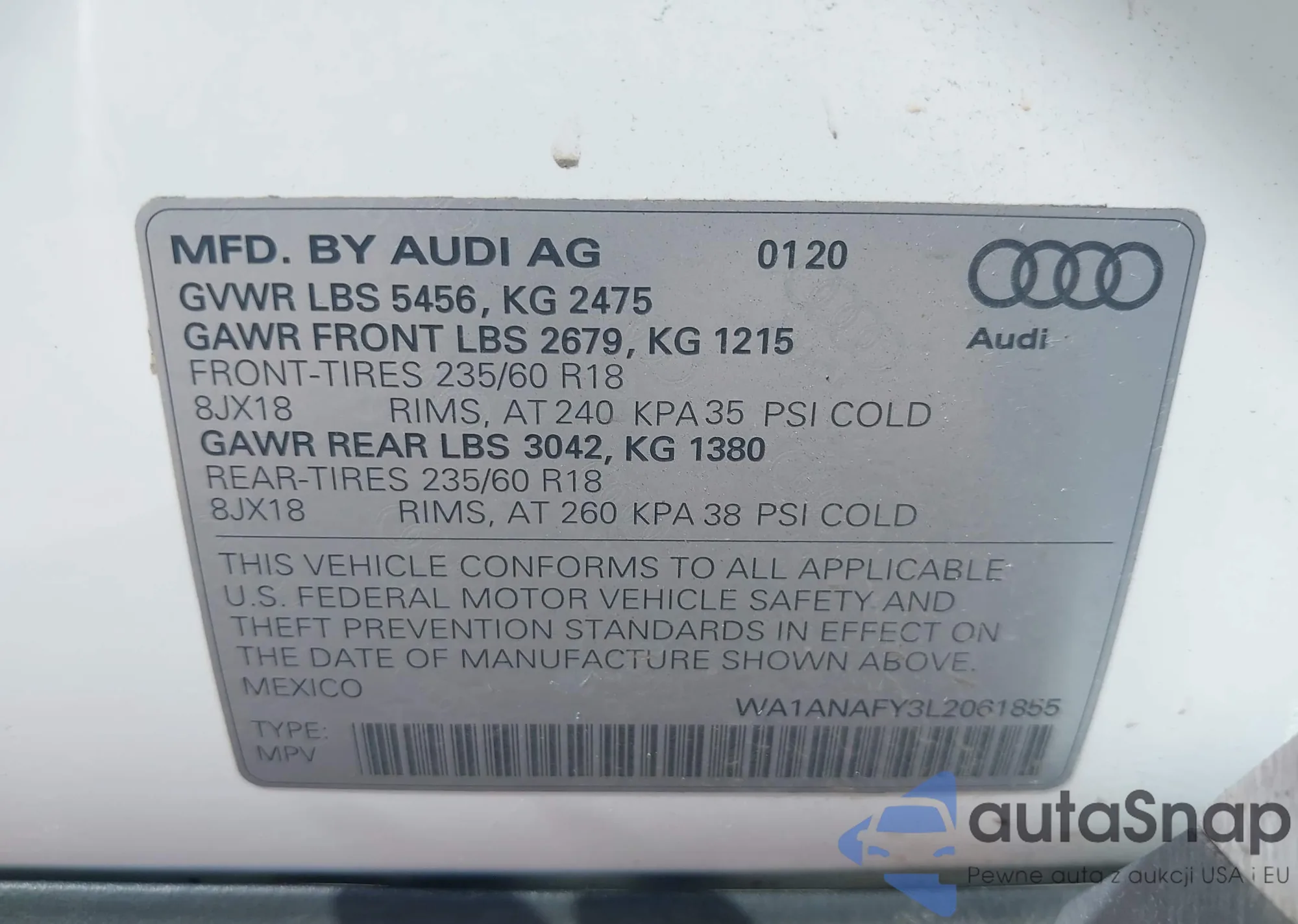 LOT: 43308948 VIN: WA1ANAFY3L2061855
