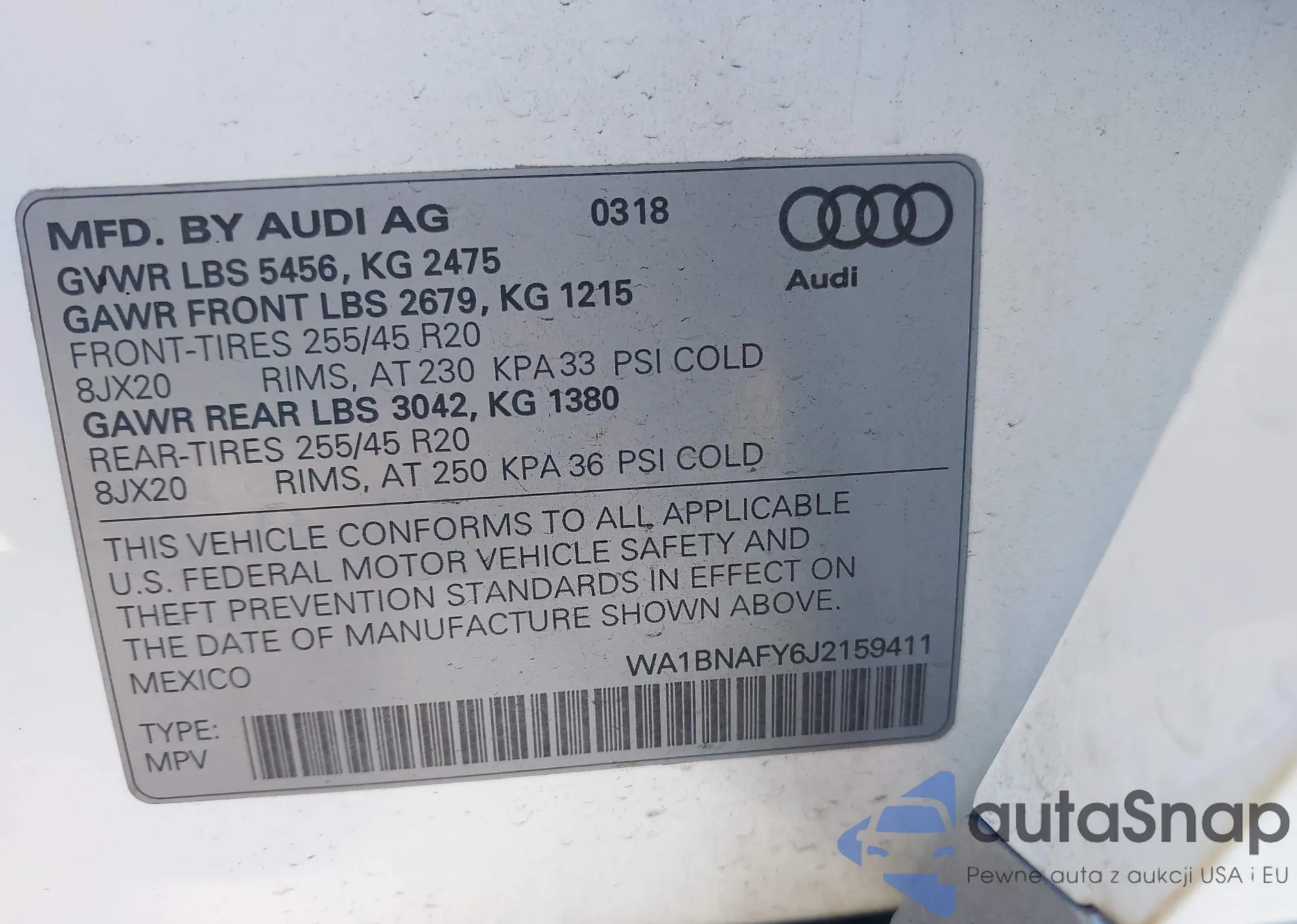 LOT: 44488838 VIN: WA1BNAFY6J2159411