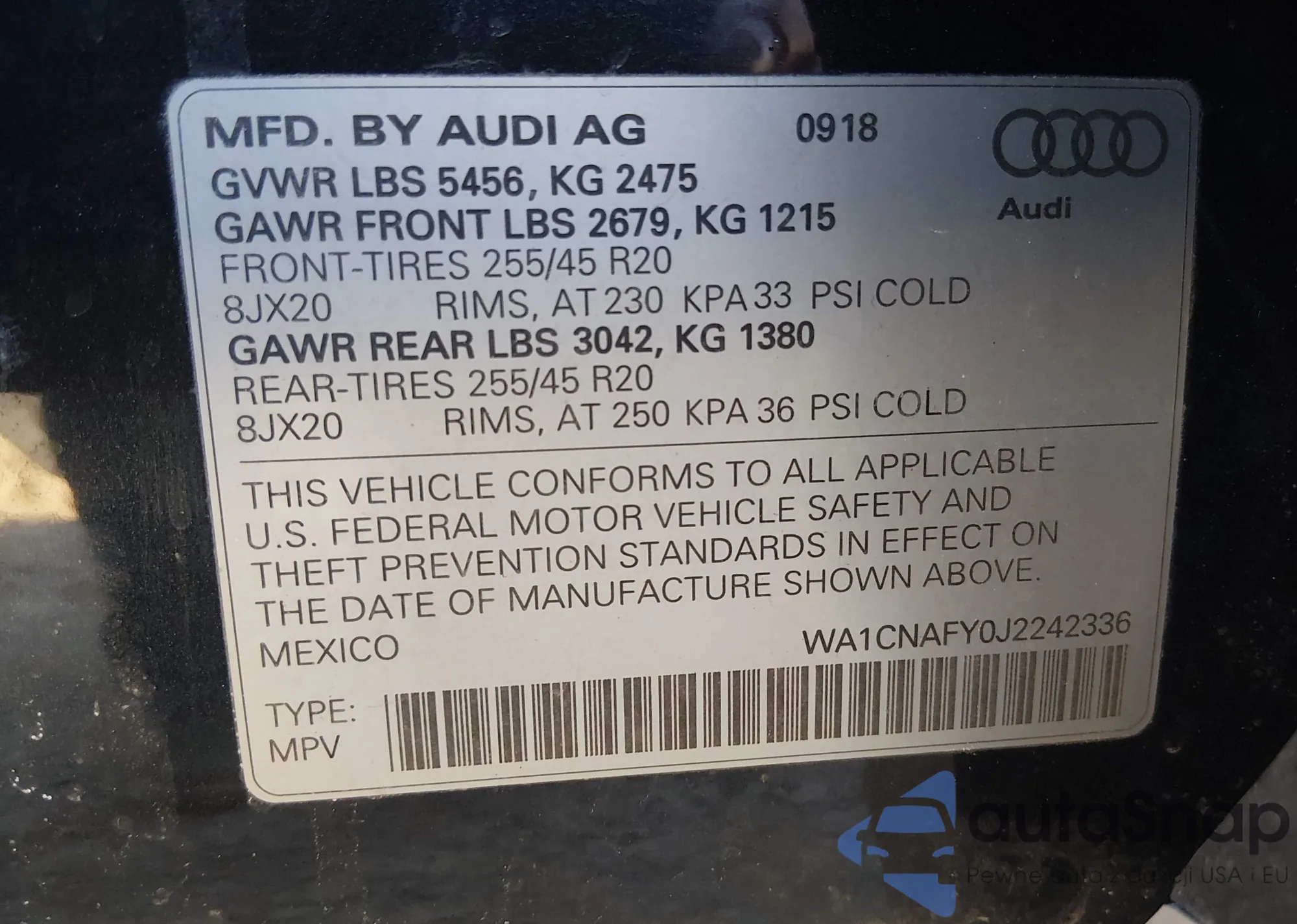 LOT: 44362767 VIN: WA1CNAFY0J2242336