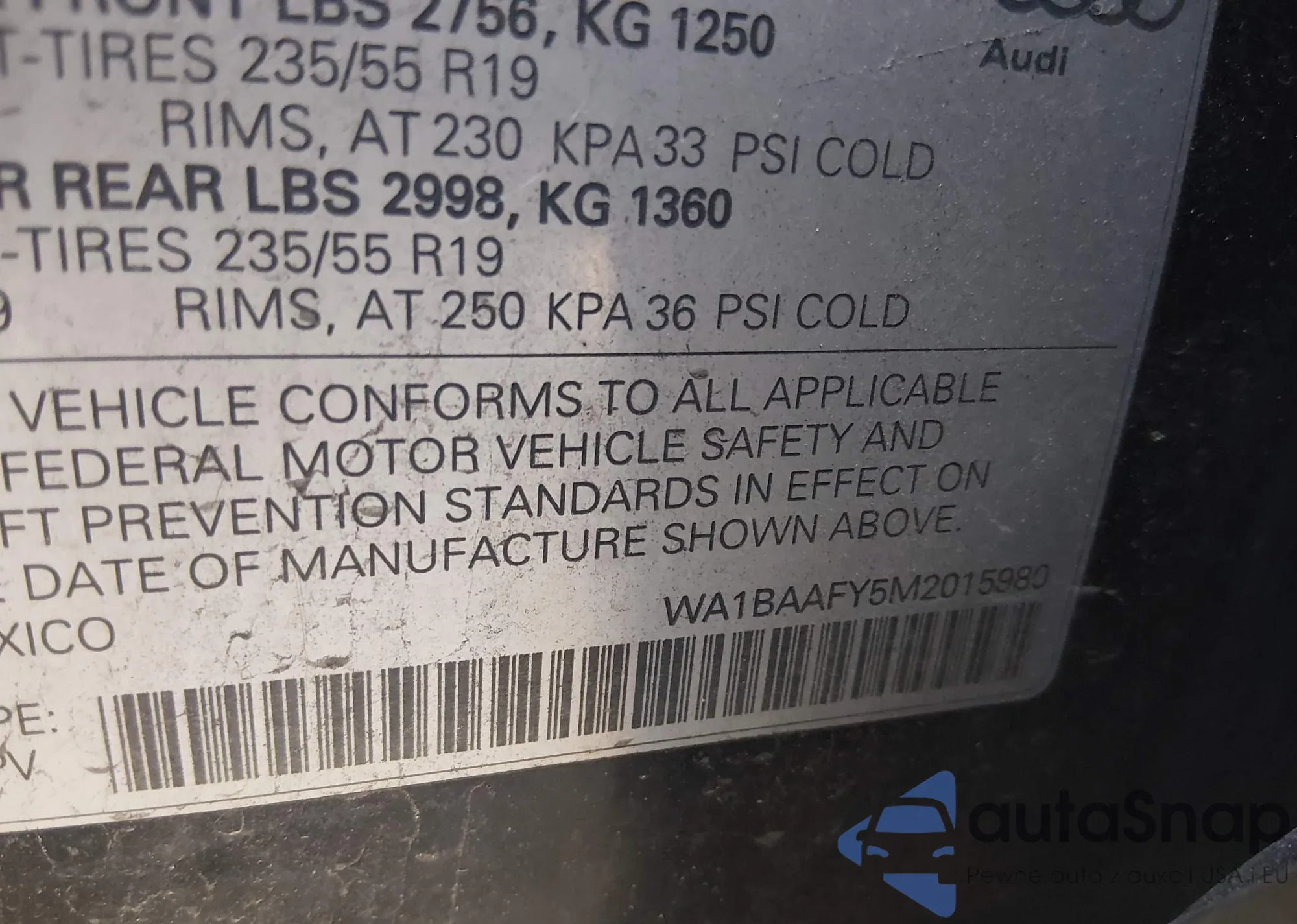 LOT: 44105963 VIN: WA1BAAFY5M2015980