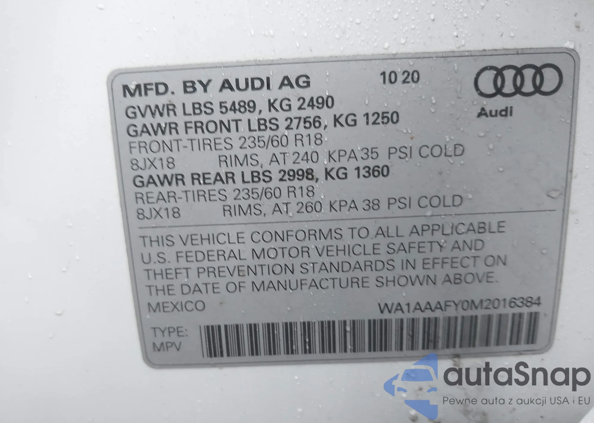 LOT: 44544648 VIN: WA1BAAFY7M2073427