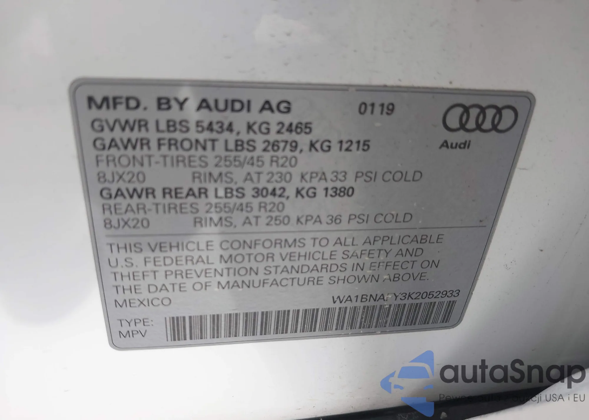 LOT: 44310662 VIN: WA1BNAFY3K2052933