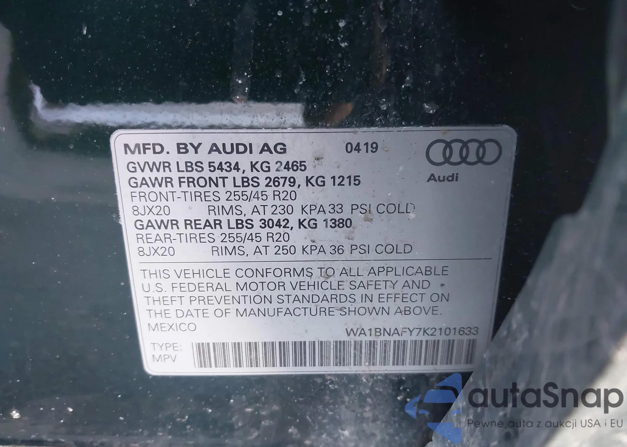 LOT: 44396639 VIN: WA1BNAFY5L2107593