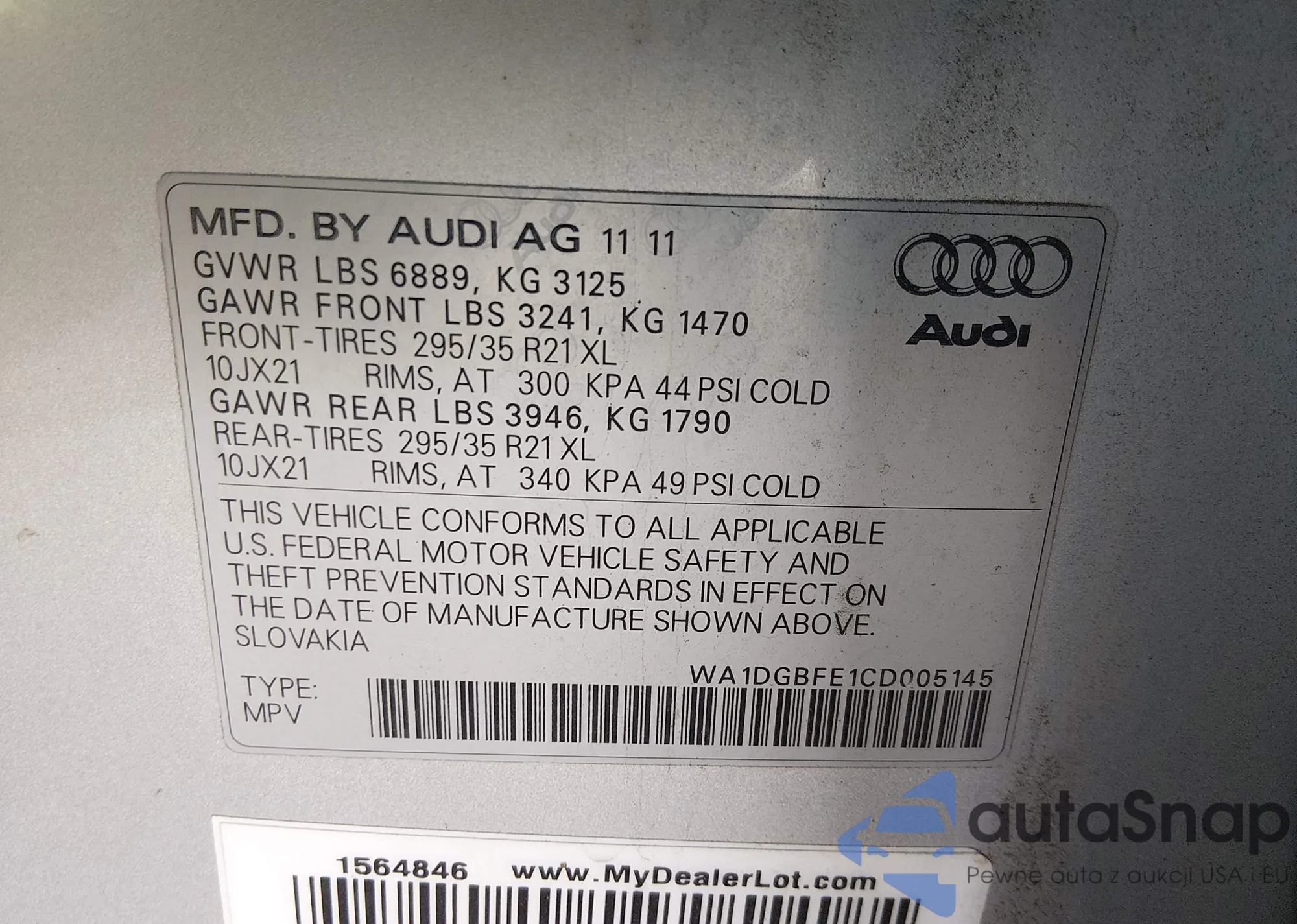 LOT: 44700512 VIN: WA1BV74L57D036528