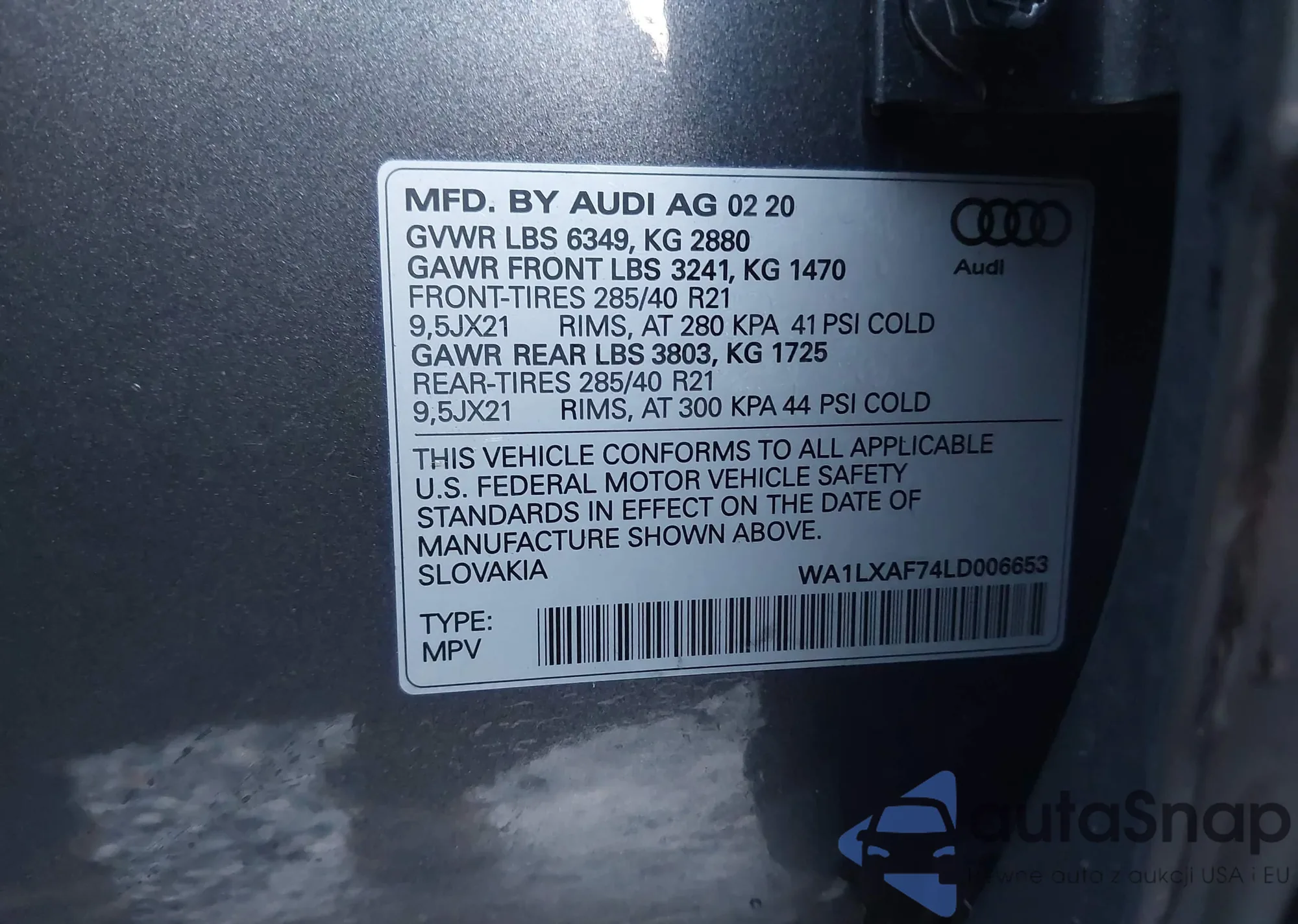 LOT: 44141804 VIN: WA1LXAF74LD006653